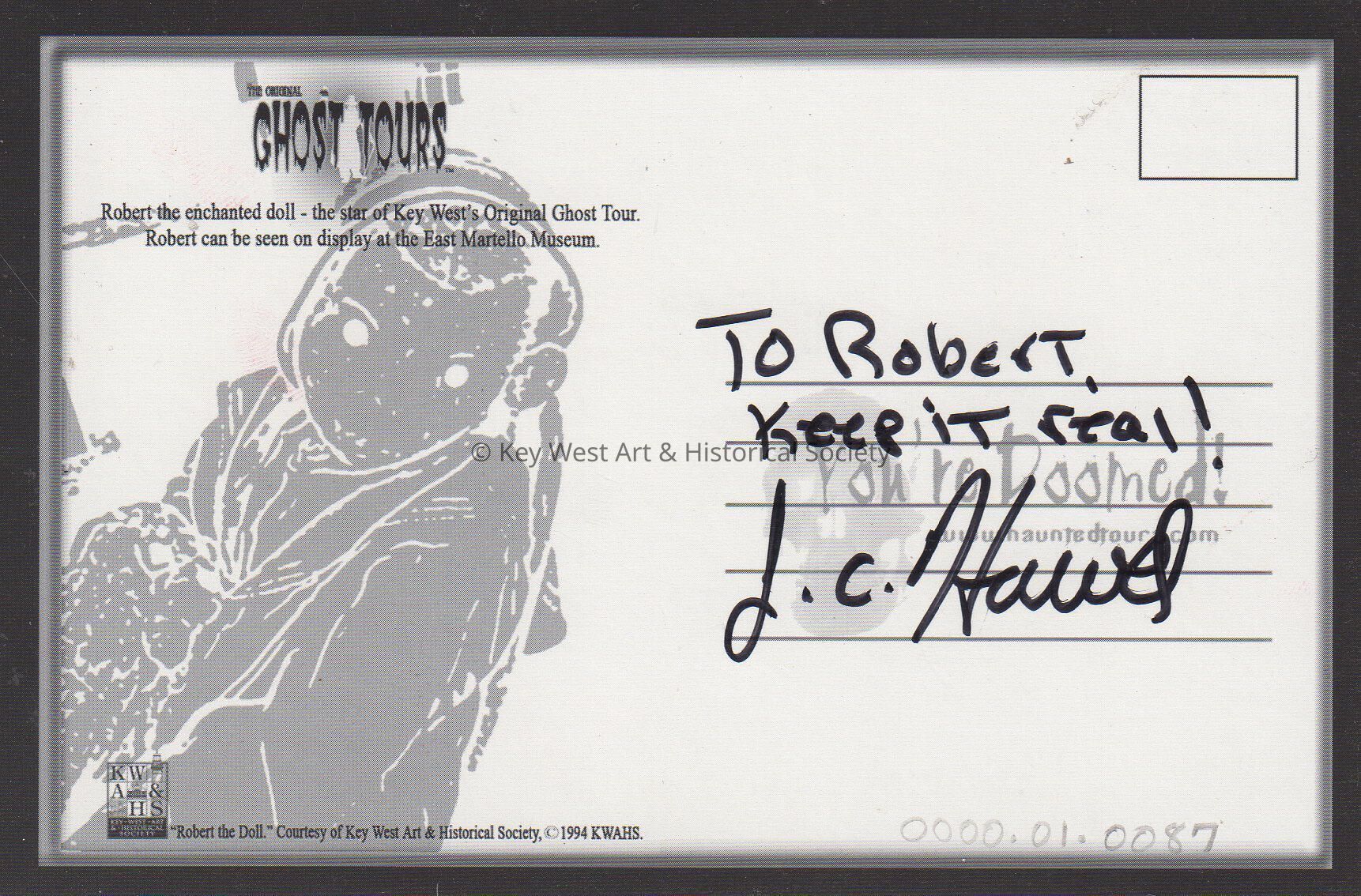 Postcard depicting Robert the Doll.  The caption reads, 'Robert the Doll, the original Ghost Tours'.  The description on the verso reads, 'Ghost Tours, Robert the enchanted doll - the star of Key West's Original Ghost Tour.  Robert can be seen on display at the East Martello Museum.  You're Doomed, www.hauntedtours.com'.  The message on the verso reads, 'To Robert, Keep it real!  J.C. Howel'.Collection