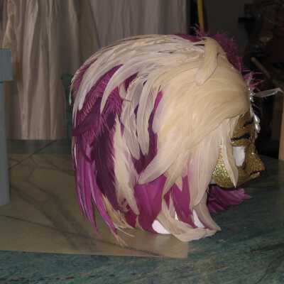 Full headdress mask designed by Mike Stark. Gold and purple sequin mask with ivory and purple feathers covering the head. Pearl applique on left forehead of the mask.