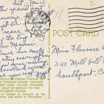 Postcard depicting Seven Mile Bridge spanning Pigeon Key and looking toward Moser Channel. An important deep water channel from the Gulf of Mexico to the Atlantic Ocean. This Key or island is located on the Overseas Highway just south of Marathon.Collection