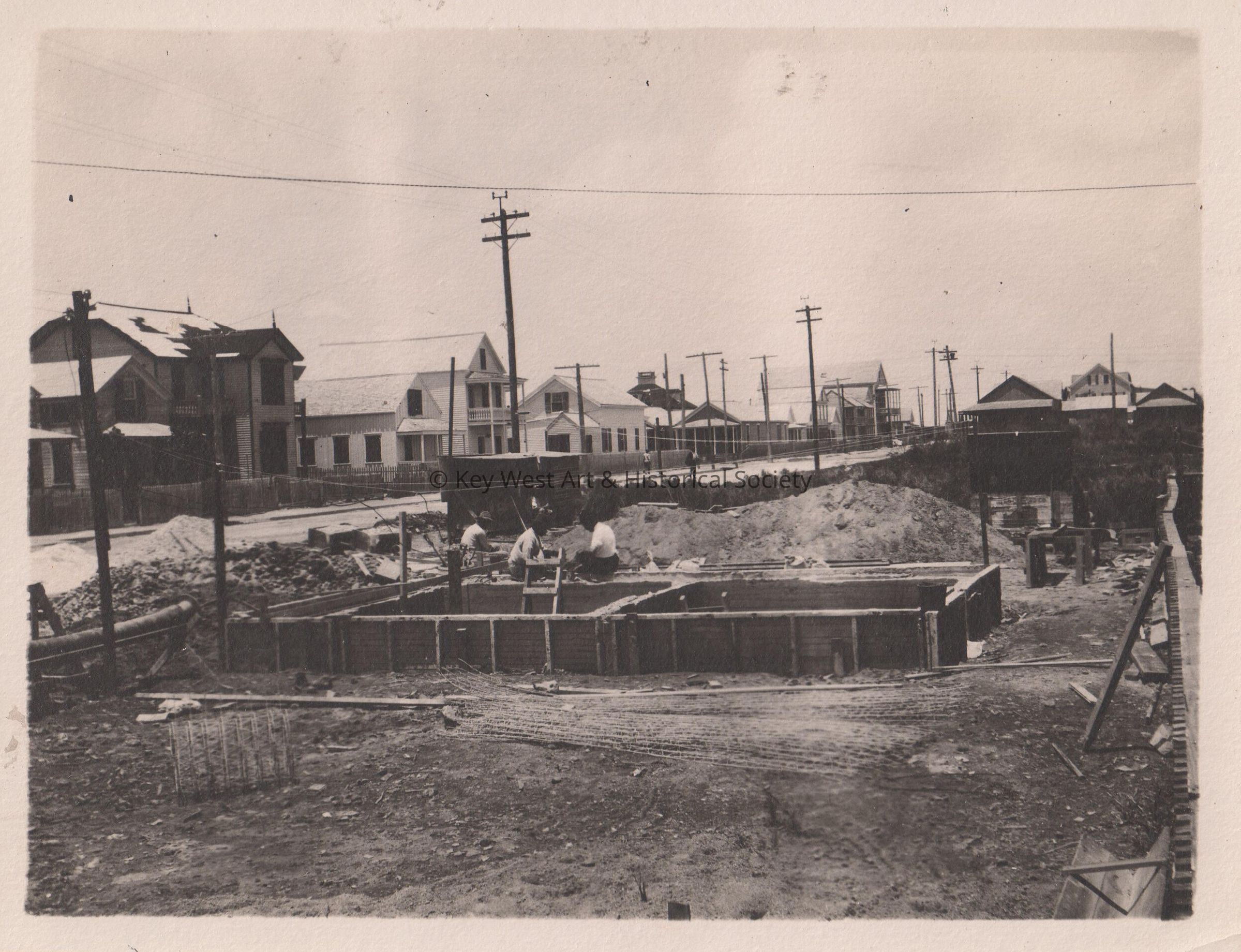 Black and white photo taken after the 1910 hurricane showing the storm damage. Image shows houses along one side of the street with some roof damage and a construction project on the other side of the street.Collection