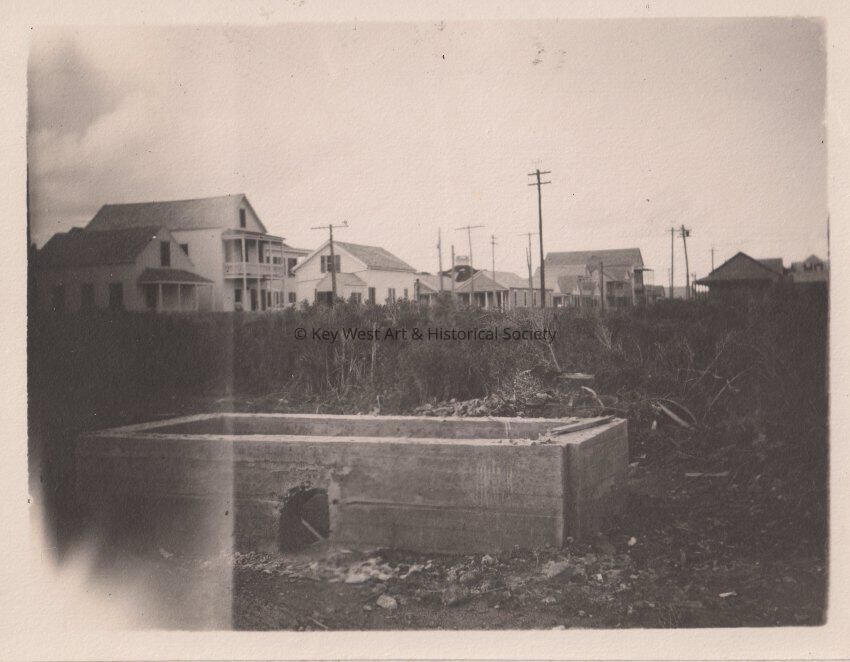 Black and white photo taken after the 1910 hurricane showing the storm damage. Image shows houses on one side of the street and a overgrown field on the other side.Collection
