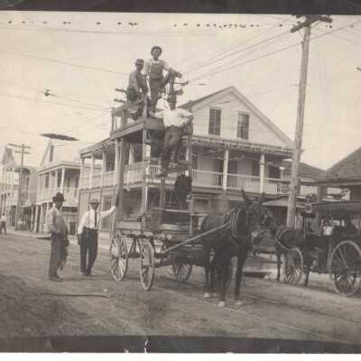 Black and white photograph of unknown men on a burro-drawn cart in front of the Key West Electric Company building at 141 Duval Street taken after the 1910 hurricane. The cart was operated by the electric company to fix power and telephone lines.