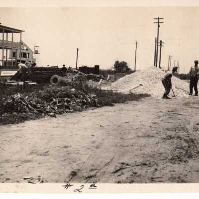 Black and white photo taken after the 1910 hurricane showing the storm damage and unknown men working near a rock pile.Collection