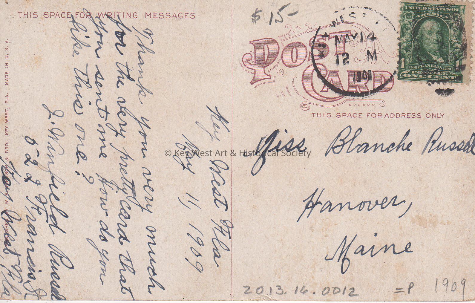 May 11, 1909, Thank you very much for the very pretty card that you sent me.  How do you like this one?  J. Winfield Russell, 522 Frances Street, Key West, Florida.Language