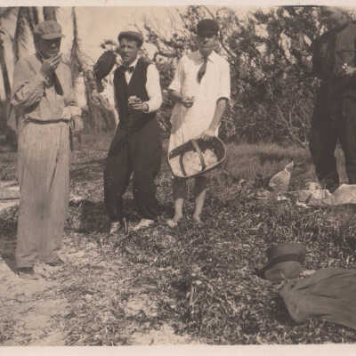 Black and white photograph of four unknown men having a picnic on Loggerhead Key.Collection
