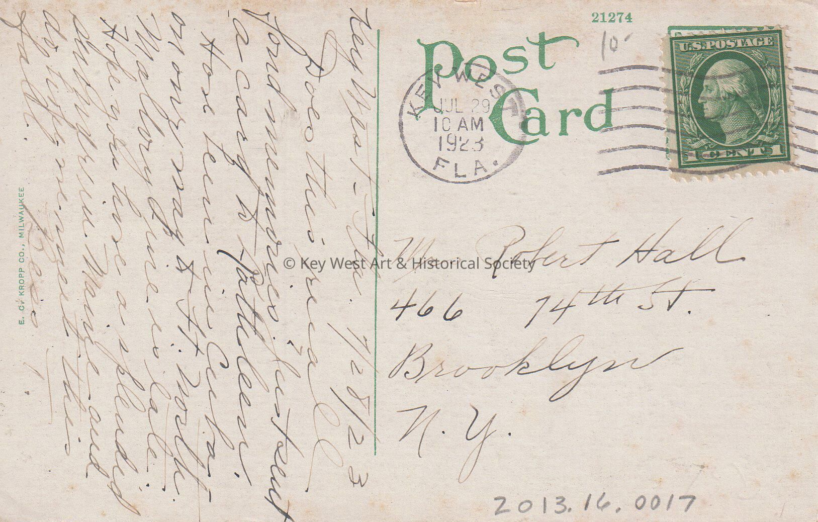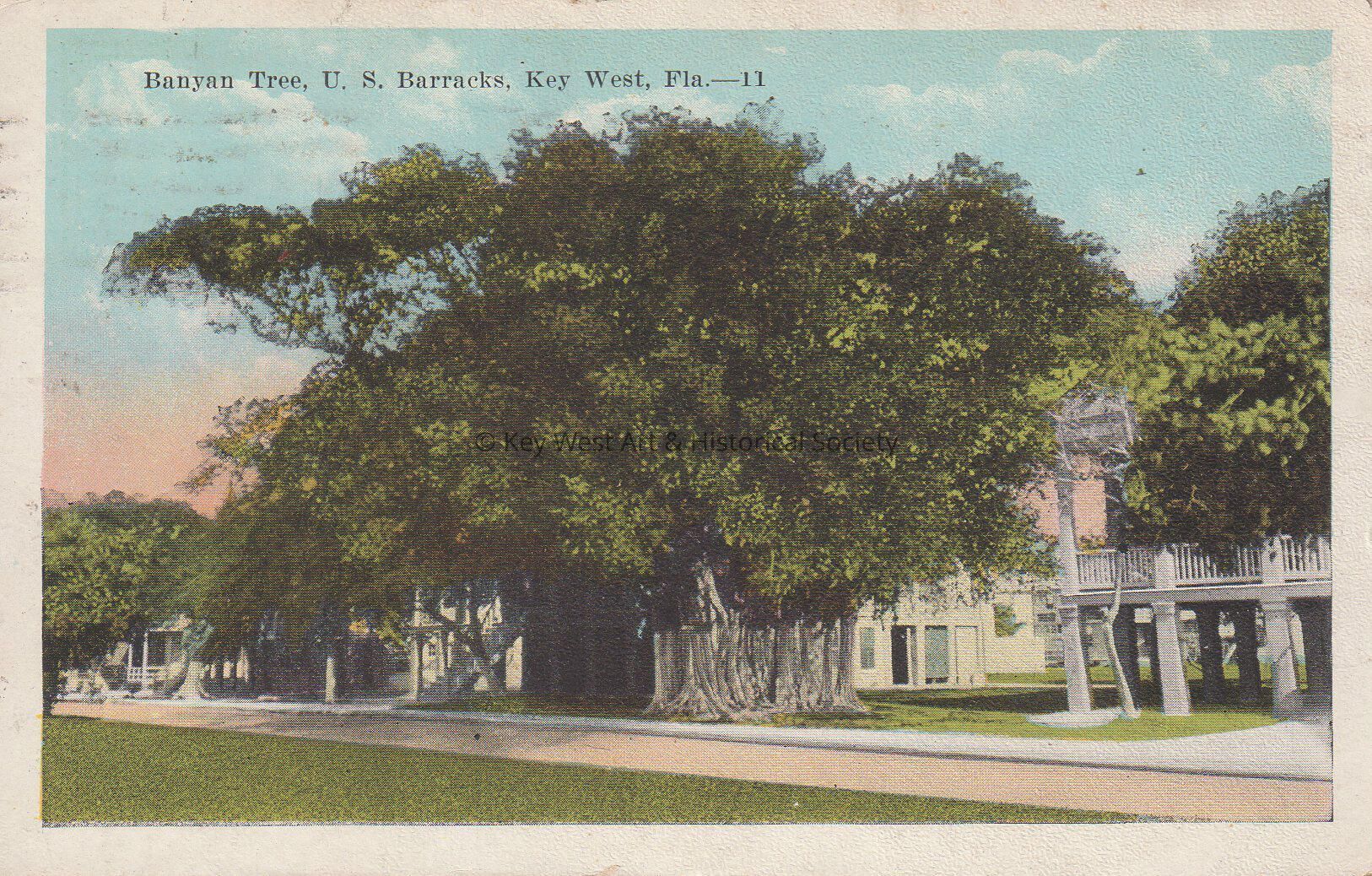 Postcard depicting a large banyan tree with buildings in the background. The caption reads, ‘Banyan Tree, U.S. Barracks, Key West, Florida.’ The message on the verso reads, 'Key West, Florida, July 28, 1923, Does this recall fond memories? Just sent a card to Kathleen. Have been in Cuba - on our way to Fort Worth. Mallory Line is late. Hope you have a splendid summer in Maine and do ___ this fall. Bess'. The card is addressed to Mrs. Robert Hall, 466 74th Street, Brooklyn, New York, and is postmarked Key West, July 29, 1923.Subject Person/Organization