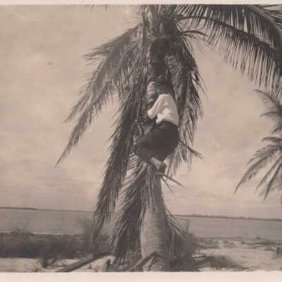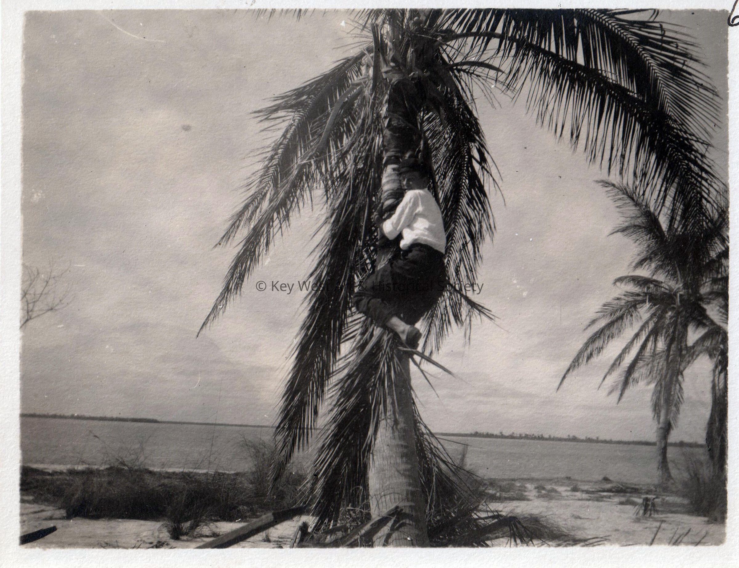 Black and white photograph of unknown man climbing a palm tree on Loggerhead Key.Collection