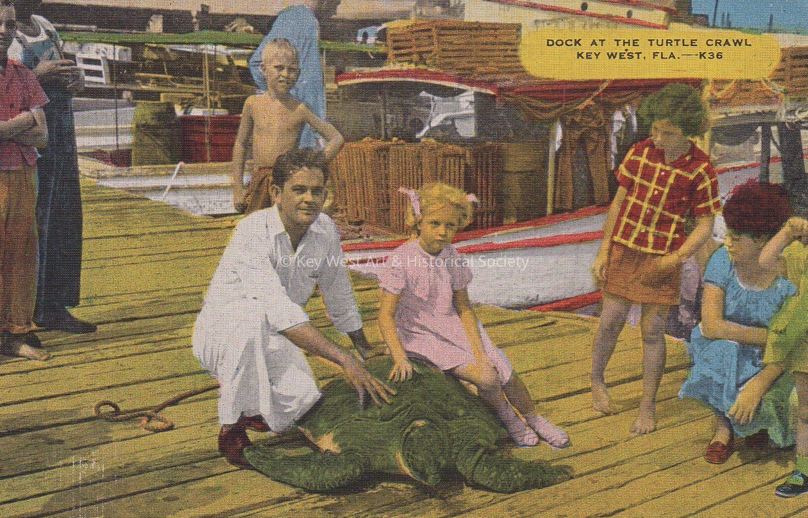 Postcard depicting children and adults with a large turtle on the docks in front of Turtle Kraal at the Key West Bight.  The caption reads, ‘Dock at the Turtle Crawl, Key West, Florida’.  The description on the verso reads, 'Giant turtles are of great interest, awe-inspiring to youngsters, some are imported from the Galapagos Islands weighing almost 300 pounds.'  The message on the verso reads, 'Darling Sheila Ann, Grammie is down here for a short visit, many thanks for the school papers.  Do study and get good marks.  Bye Bye my darling, Grandma Gerhart'.  The card is addressed to Miss Sheila Ann Gerhart, 326 Miller Street, Reading, Pennsylvania, and is postmarked Key West, February 6, 1955.Subject Place