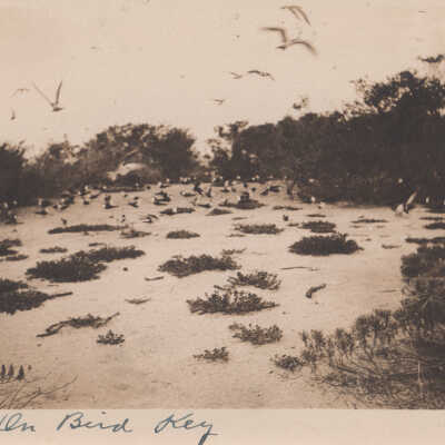 Black and white photo taken on Bird Key in the Dry Tortugas. Image shows birds on the ground and flying. Caption reads 'On Bird Key'.