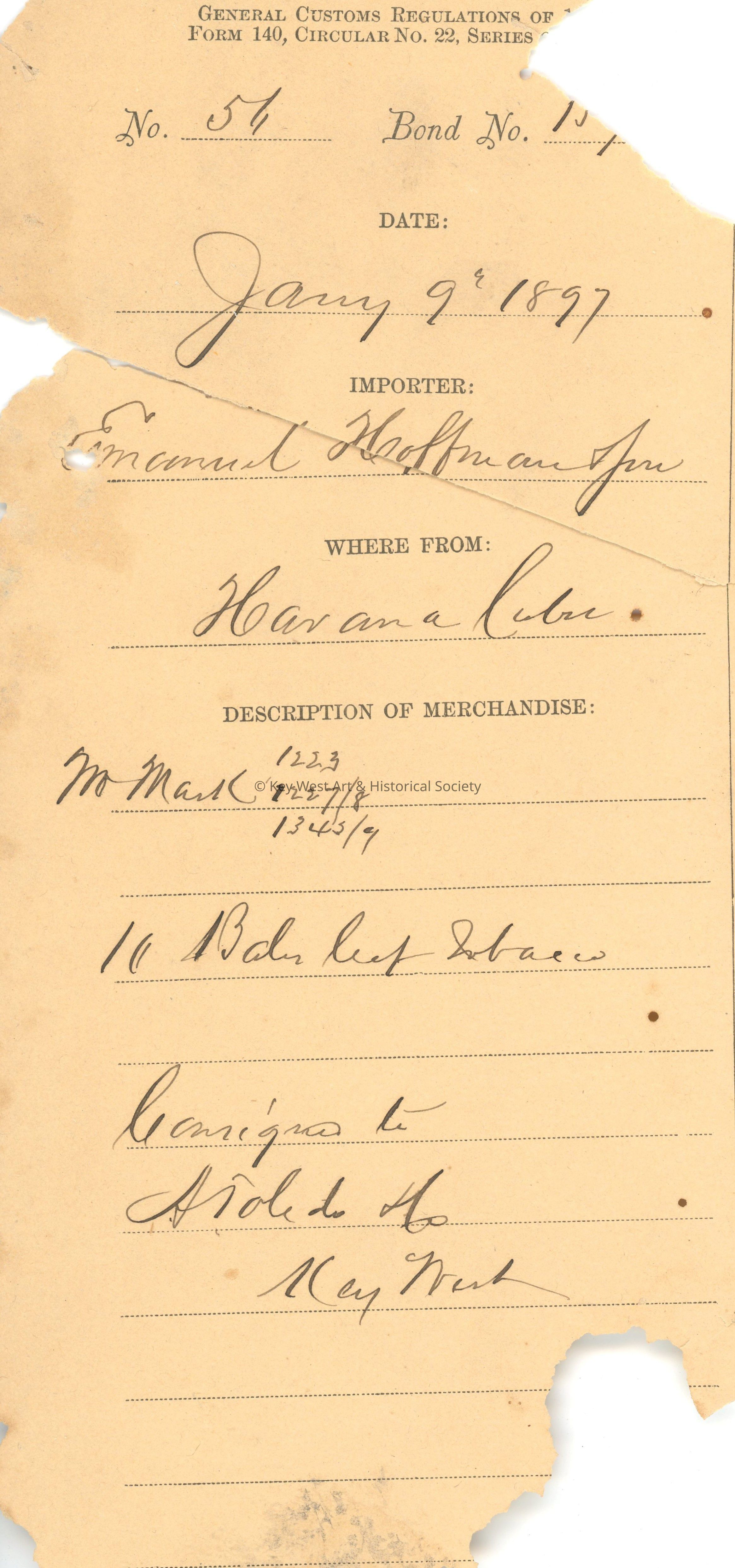 Customs receipt for the importation of sixteen bales of leaf tobacco from Havana, Cuba by Emanuel Hoffman & Son which were consigned to A. Toledo & Co. in Key West. Dated January 9, 1897.