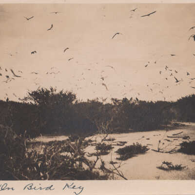 Black and white photo taken on Bird Key in the Dry Tortugas. Image shows birds in the air. Caption reads, 'On Bird Key'.