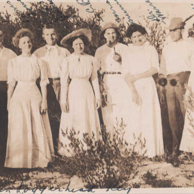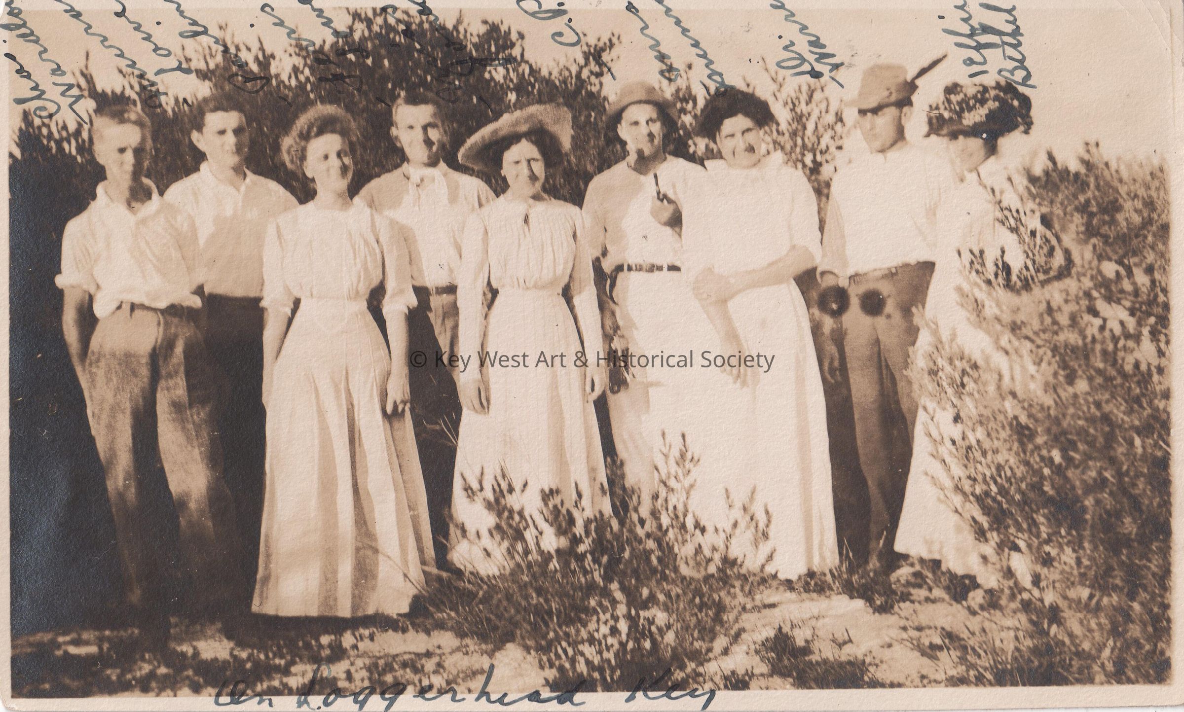 Black and white photograph taken on Loggerhead Key in the Dry Tortugas.  From left to right, Charles. Wardlow, Murray Lowe, Pauline Wardlow, Ferris Lowe, Laura Jones, C.P., Mrs. Munroe, Dr. Warren, and Effie Bethel.Collection