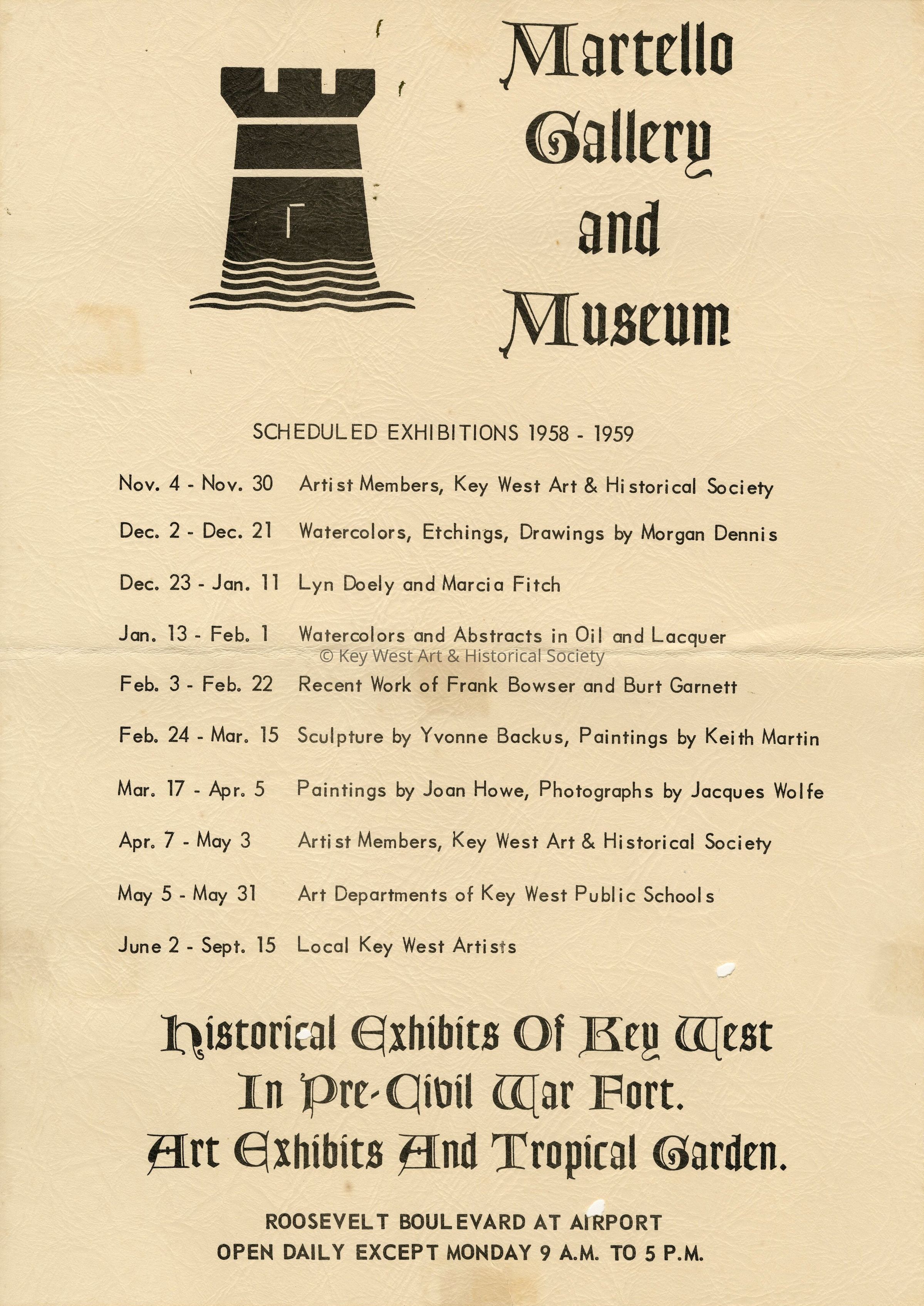 Black print on white poster board advertising season events for 1958-1959 held at the Martello Museum and Gallery.  Caption reads, 'Martello Gallery and Museum Scheduled Exhibitions 1958-1959'.Collection