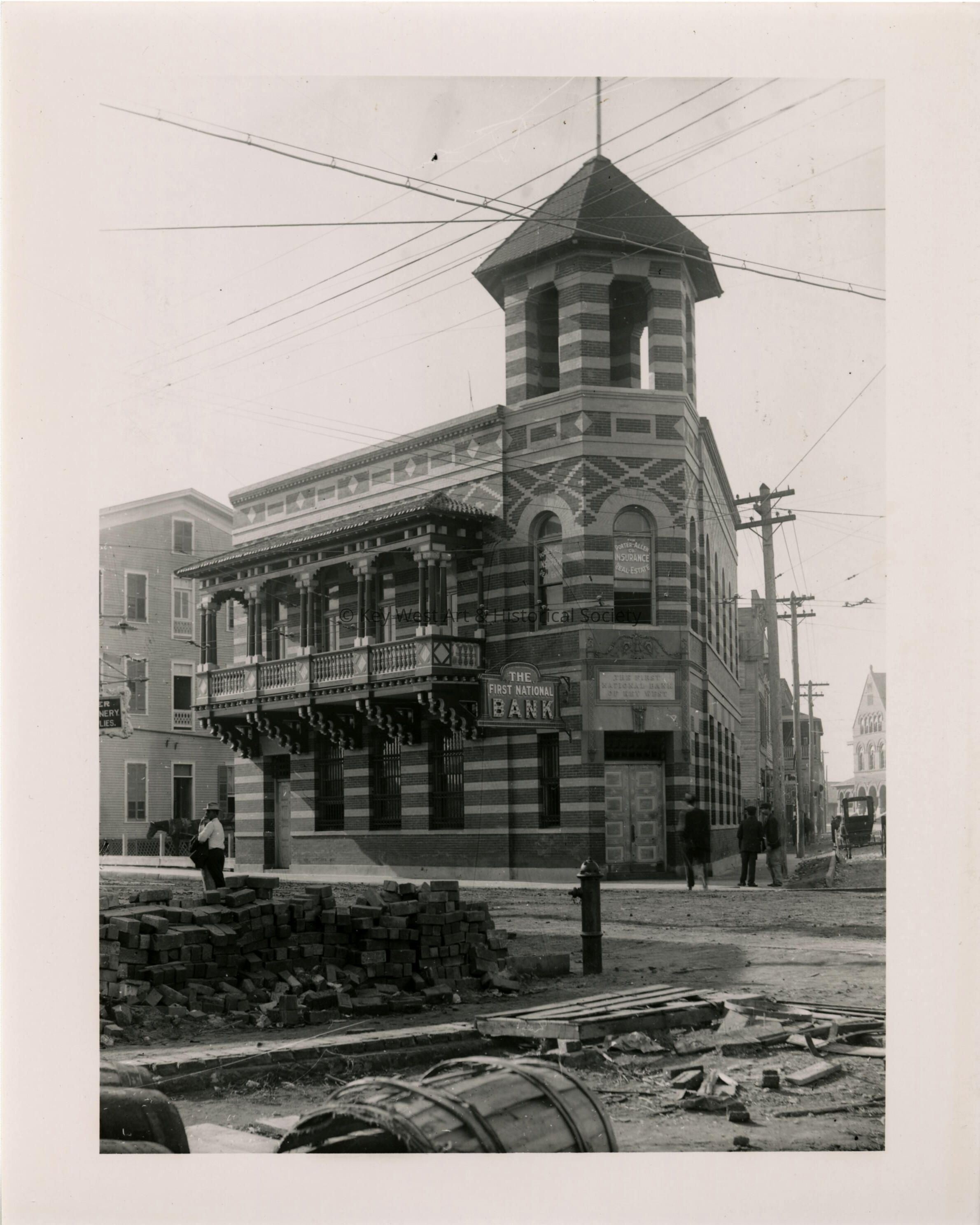 Black and white print taken from a dry plate glass negative of The First National Bank of Key West building at the corner of Front and Duval streets. The Porter-Allen Insurance Company office is located on the second floor.
