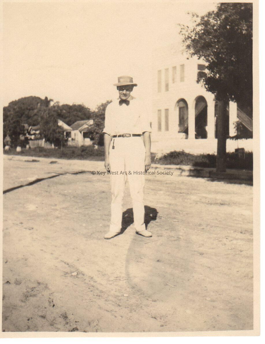 Black and white photograph of an unknown Cuban man with a light colored outfit, bowtie, and rolled up sleeves.Collection