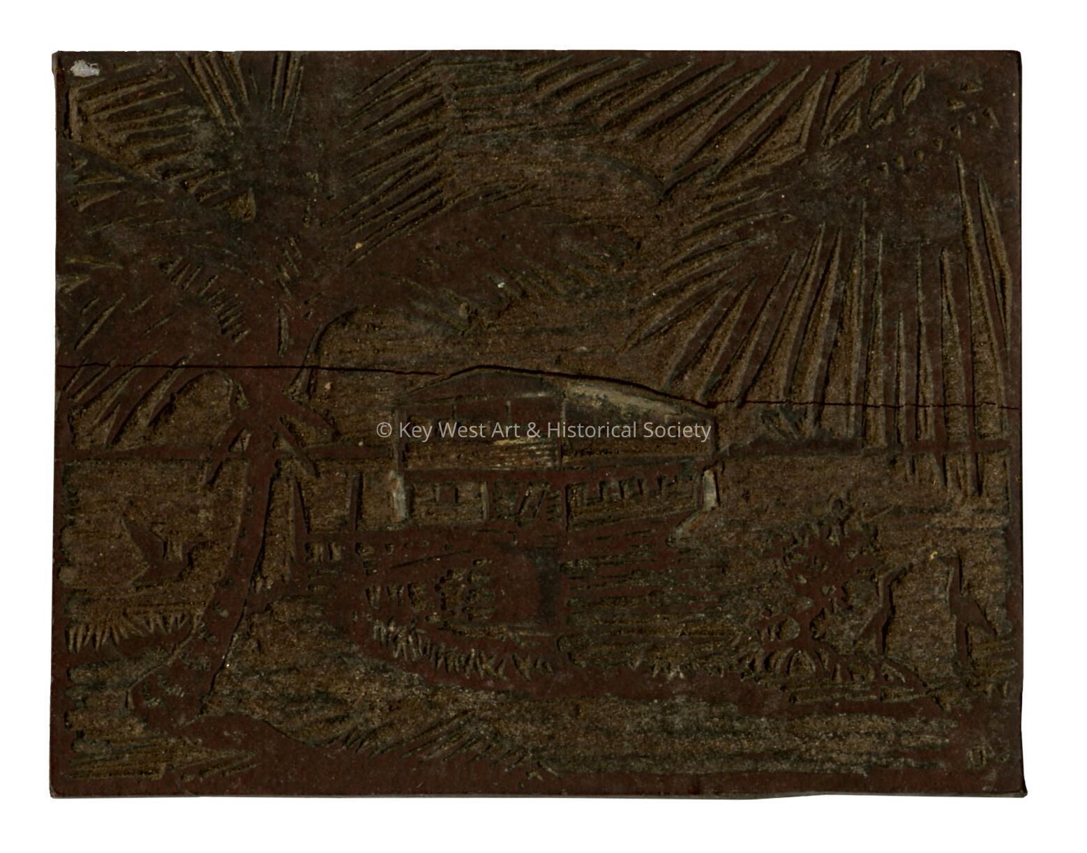 Woodcut block of a house by the water and palm trees on the shoreline.