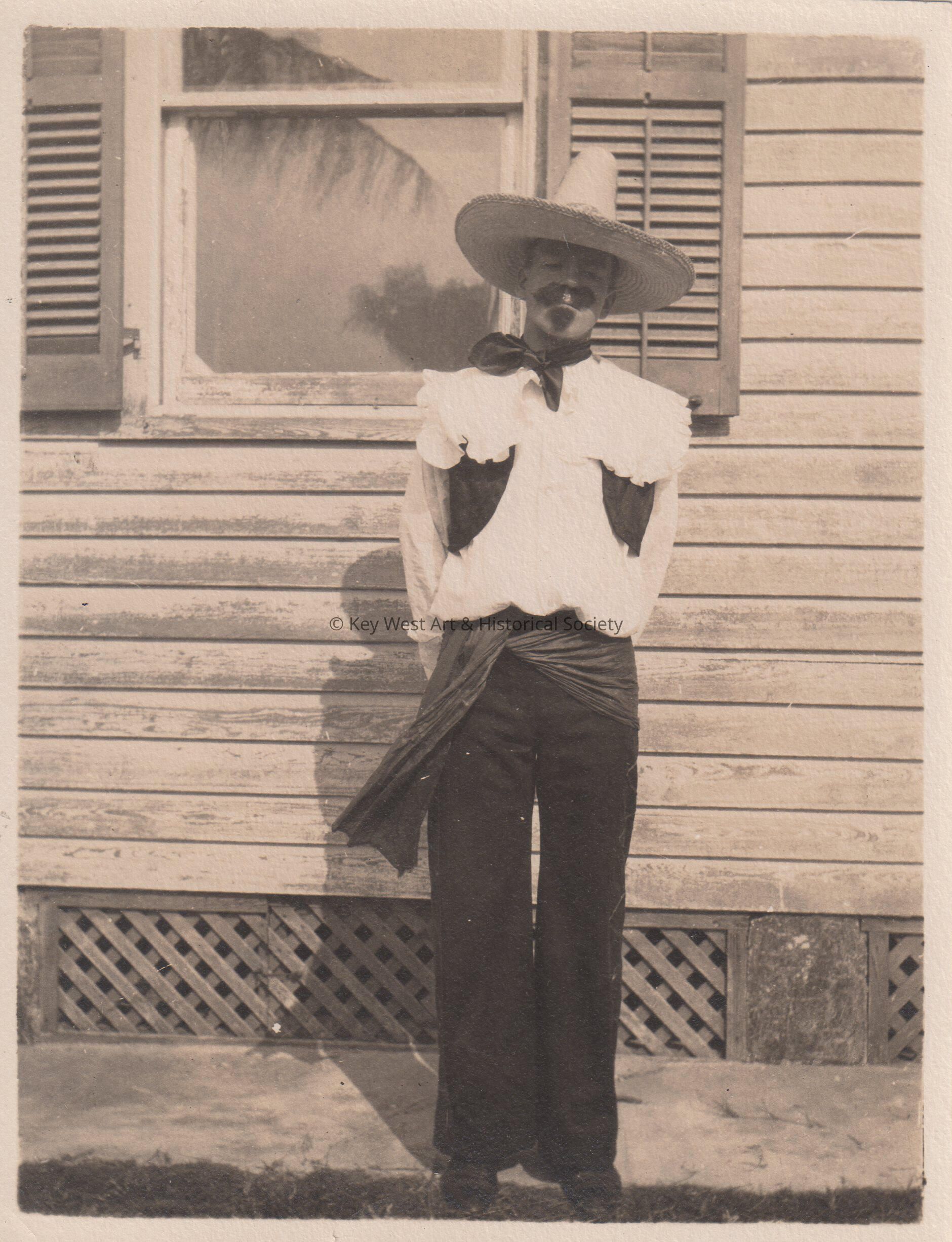 Black and white photo of a man standing in front of a house wearing a Mexican costume.Collection
