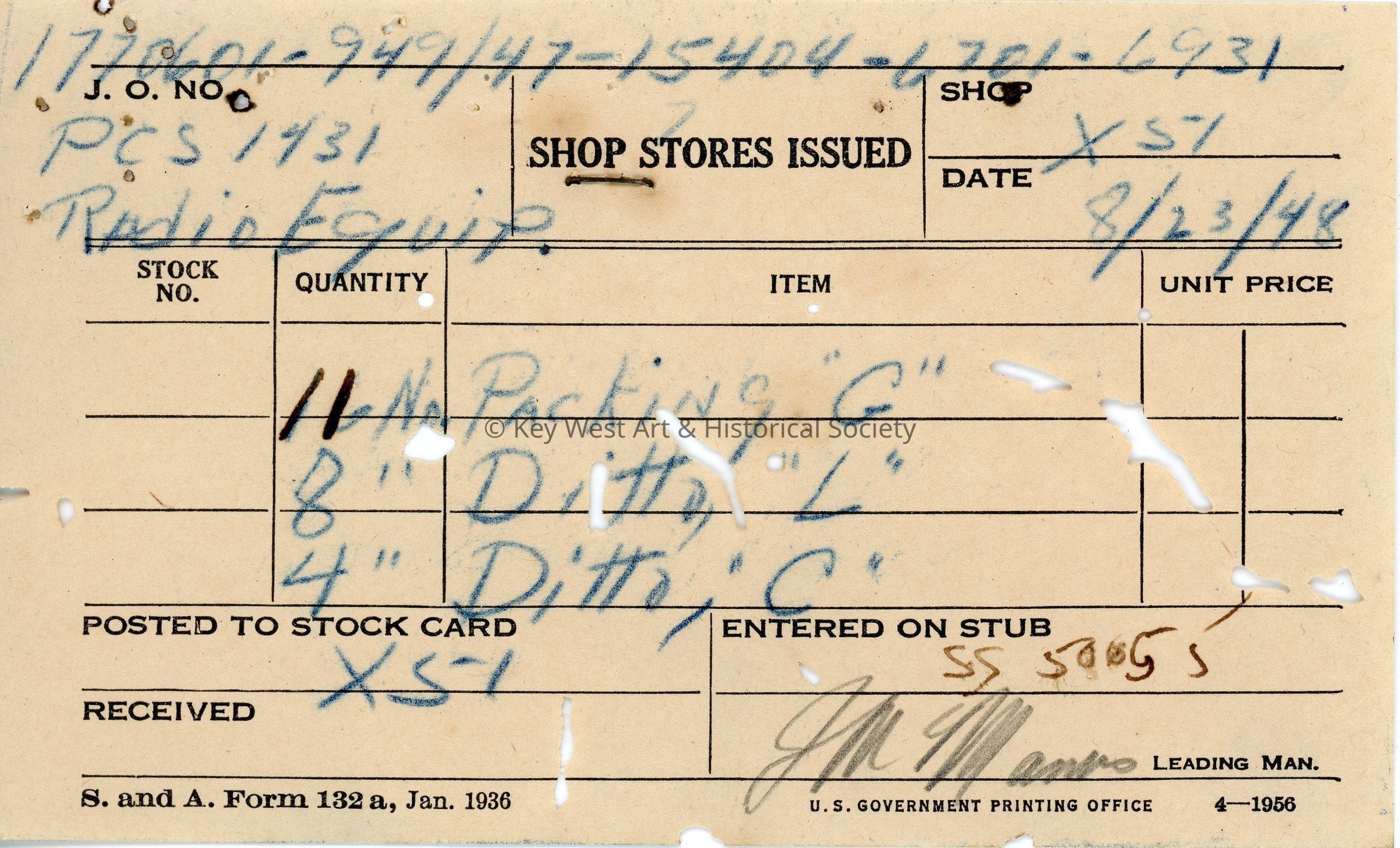 Form acknowledging the issuance of packing material to be used in the installation of radio equipment on the USS EPCS-1431 stationed at Naval Station Key West.