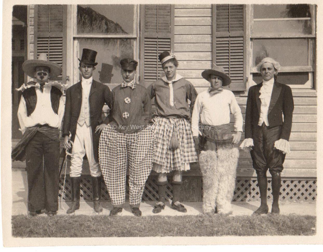 Black and white photograph of unknown men in costumes standing beside a house.Collection