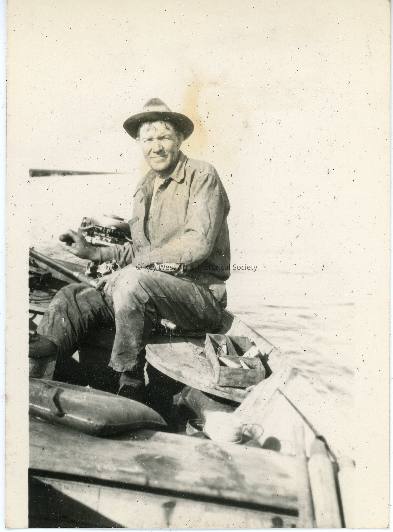 Black and white photograph of a man wearing a fedora steering a powerboat. The photo was part of a photograph album began by Victor H. Baker in 1940.