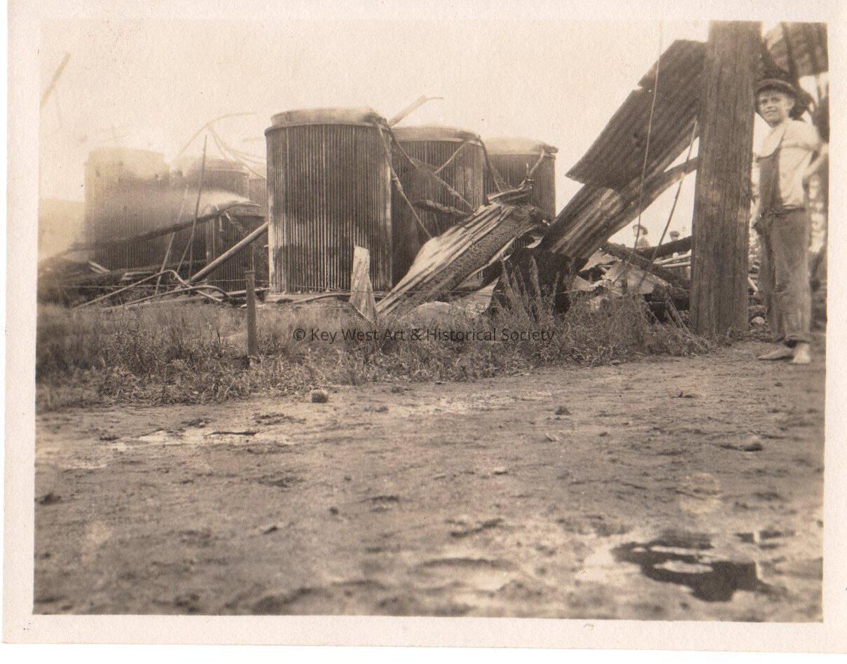 Black and white photo showing damaged electrical equipment caused by a storm.  There is a small boy standing to the right of the equipment.  Blackstone Gas and Electric Co.Collection
