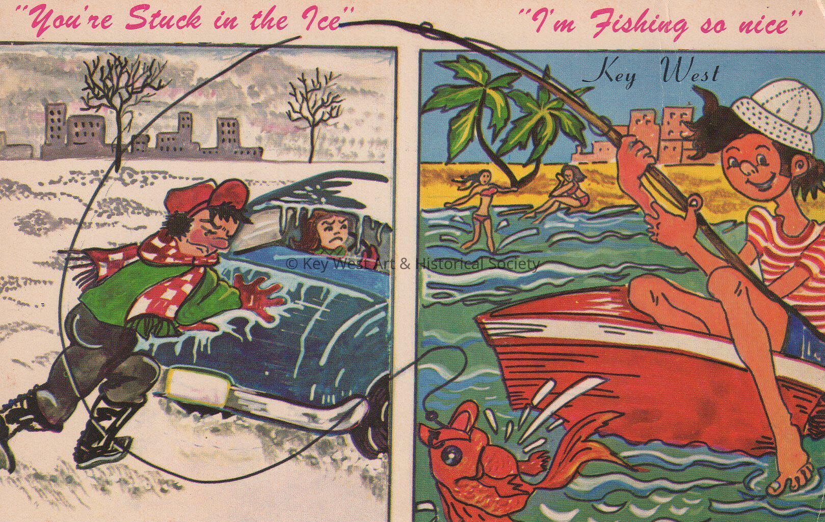 Postcard depicting two cartoons; one of people in snowy winter weather and the other of a boy fishing from a small boat near a beach.  The caption reads, ‘"You're stuck in the Ice" and "I'm fishing so nice", Key West.'Collection