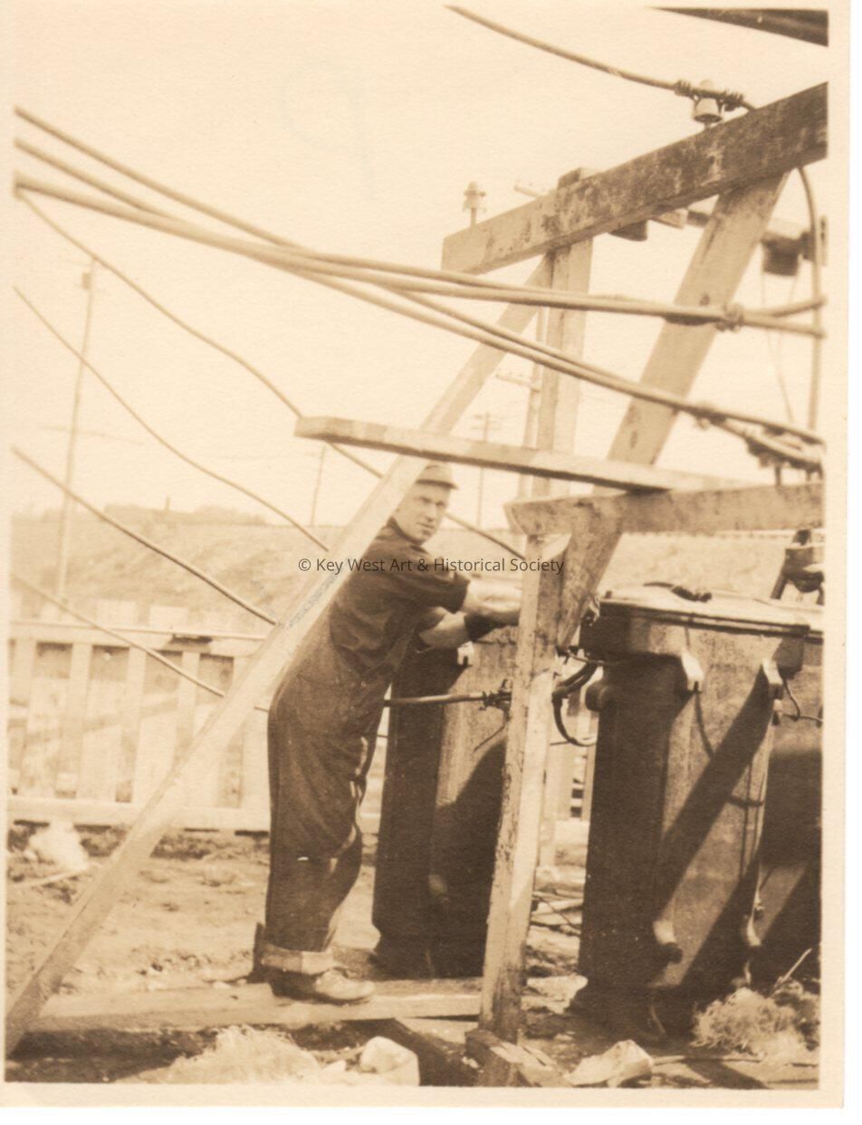 Black and white photo of a man fixing damaged electrical equipment caused by a storm. Blackstone Gas and Electric Co.Collection