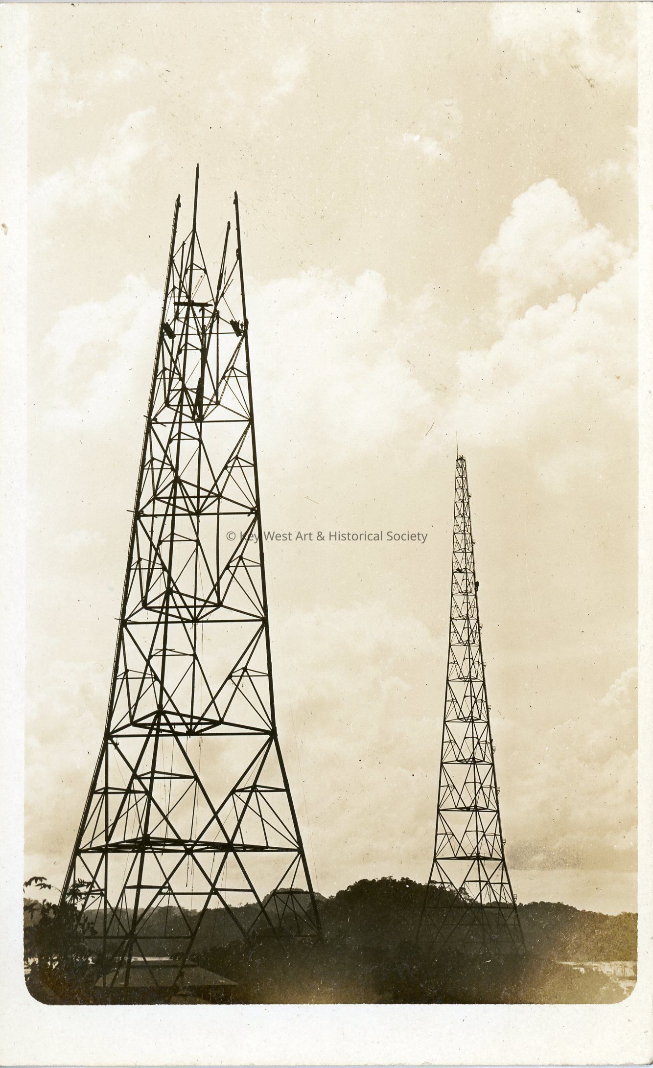 Black and white photograph postcard depicting two large metal towers, likely wireless telegraph stations. The pylon in the foreground is still under construction.Subject