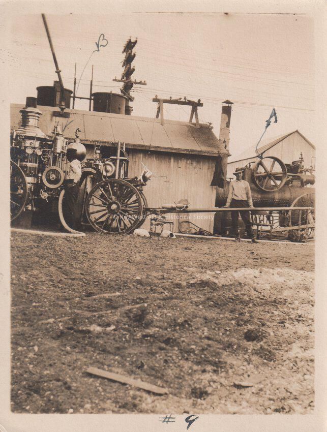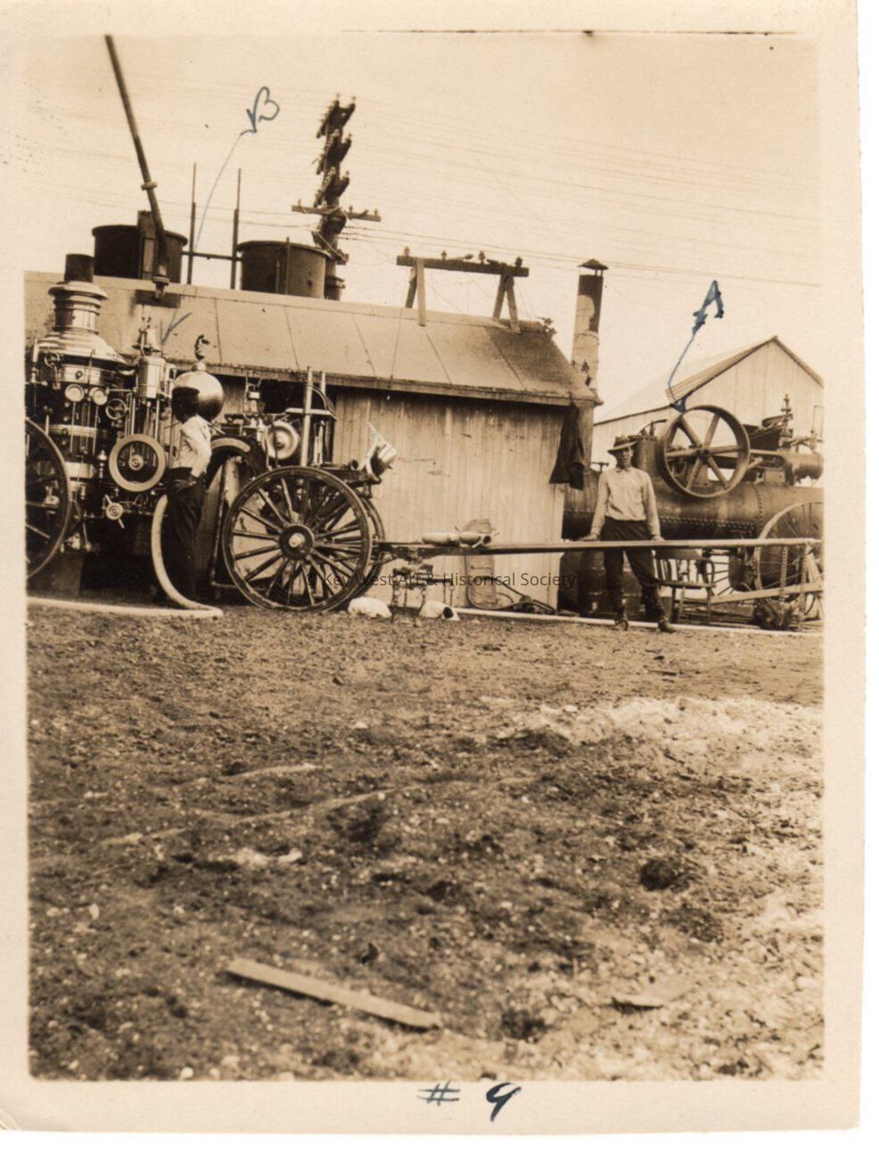 Black and white photo of two men standing in front of a fire truck or steam engine. Blackstone Gas and Electric Co.Collection