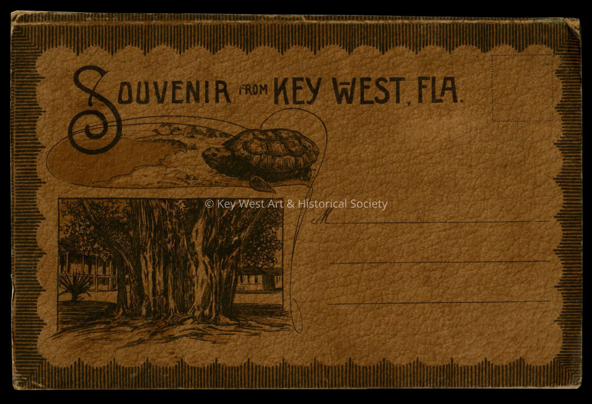 Souvenir postcard folder containing 22 images.  Bird's eye view of Key West, Florida East Coast Railway Bahia Honda Bridge, U.S.S. Maine Memorial, Train Crossing Bahia Honda Bridge, Customs House, Train crossing Long Key, East India Banyan Tree, Train crossing Long Key Bridge, Coconut Palms at the Barracks, P &O Steamer Olivette, P & O Steamer Mascotte, Sponge Catch For Sale, Convent of Mary Immaculate, Unloading of Sea Turtles, Monroe County Court House, Court Yard of Fort Martello, Duval Street looking Northwest, Marine Hospital, South Beach, Government Wireless Station, Jefferson Hotel and Duval Street.Collection