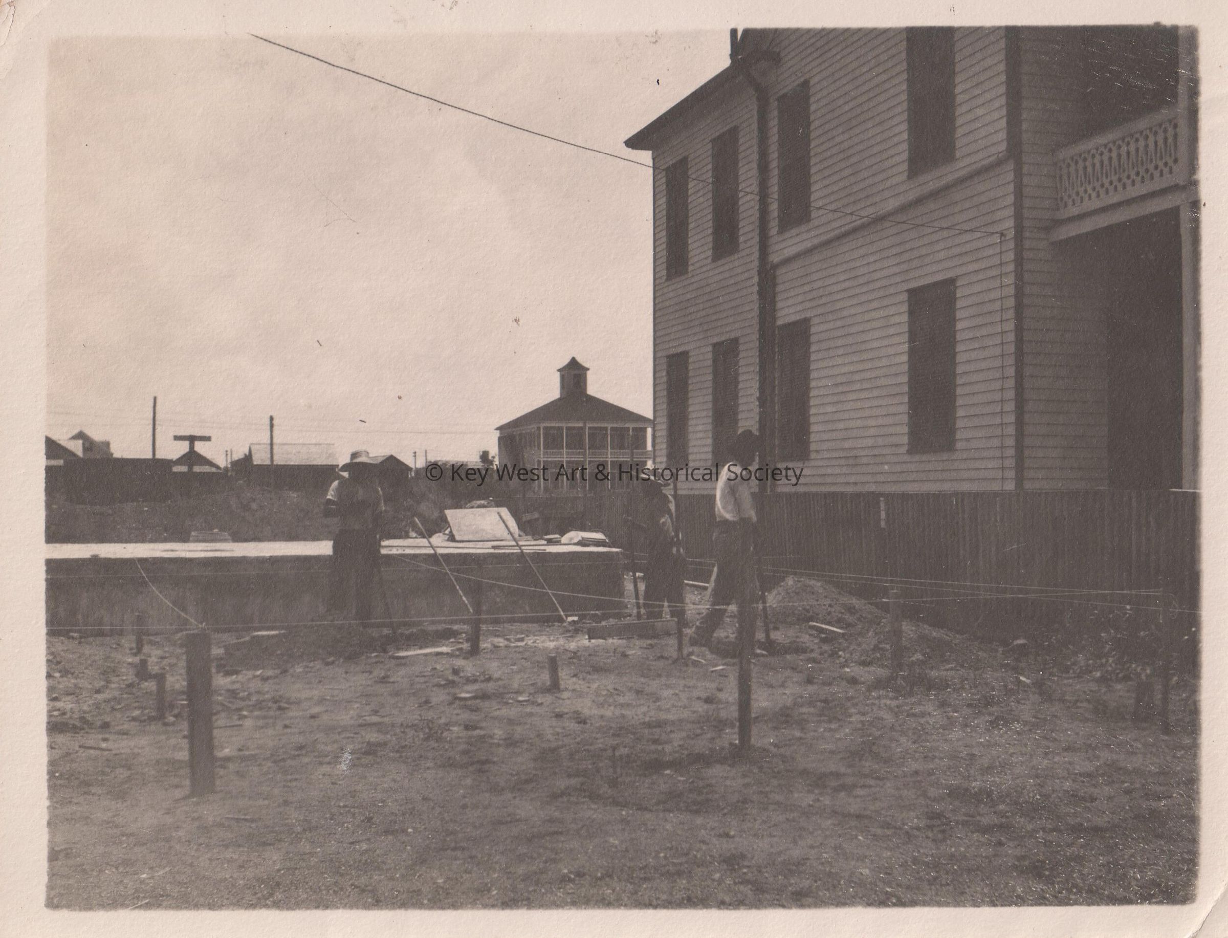Black and white photo taken from the road showing the foundation of a house being built. Photograph taken for the Blackstone Gas and Electric Company.Collection