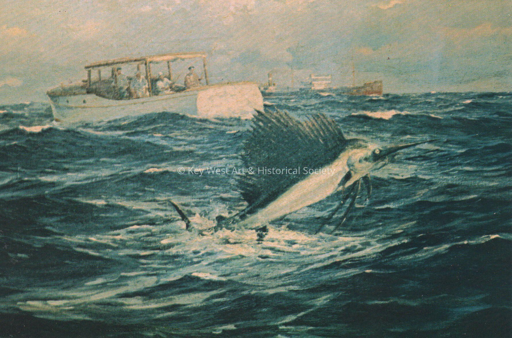 Postcard depicting a painting of a sailfish and boats.  The description on the verso reads, ‘Sailfish - Gulf Stream, Key West, Florida.  A hooked sailfish leaps out of the inky blue waters of the Gulf Stream in the Florida Keys.  The painting hangs in the Key West Chamber of Commerce.  It was done by the well known painter Anton Otto Fischer who illustated many stories for the Saturday Evening Post.  His wife was the daughter of Admiral Sigsbee, the Captain of the battleship MAINE.  They lived in Key West for many years.  Many of his paintings were made from memory of his years at sea.'Subject Place