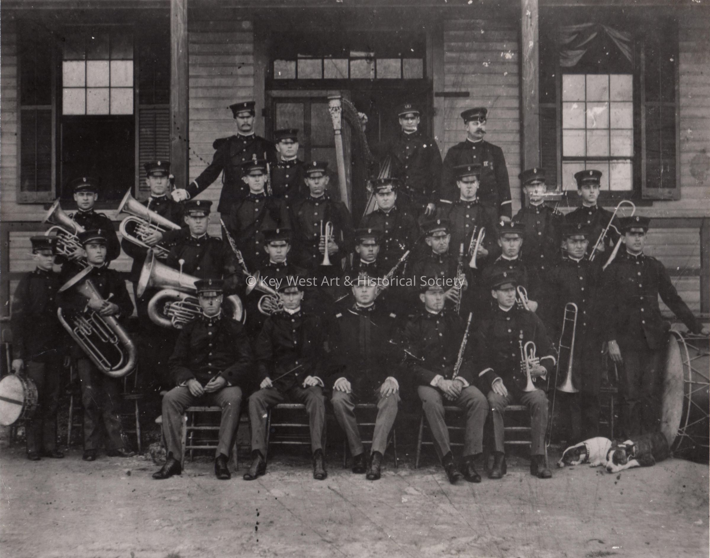Black and white photograph of the 9th Artillery Band in Key West (with harp, horns, drums, and dog).