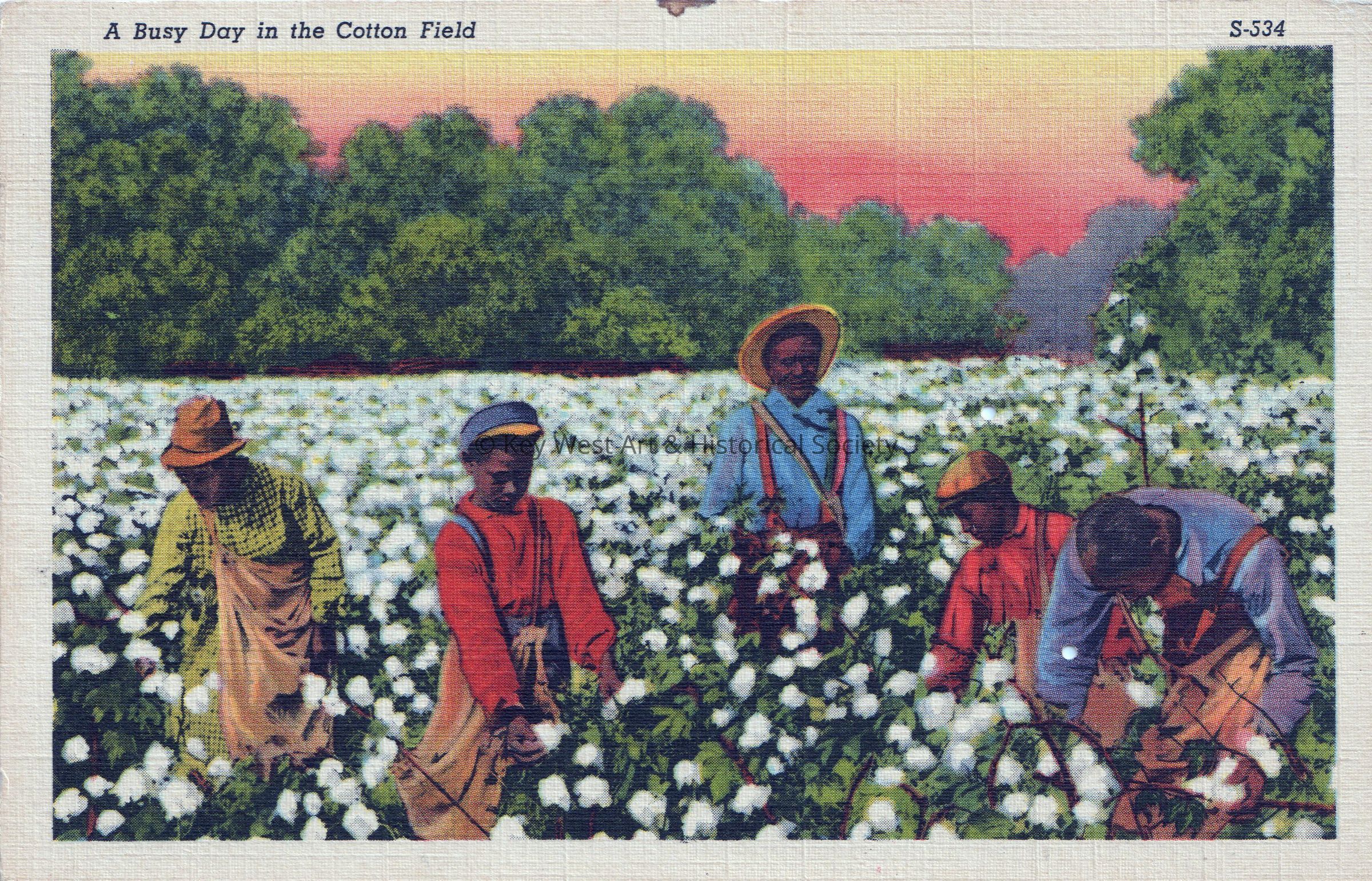 Postcard depicting men and boys picking cotton. The caption reads, ‘A Busy Day in the Cotton Field.’Collection
