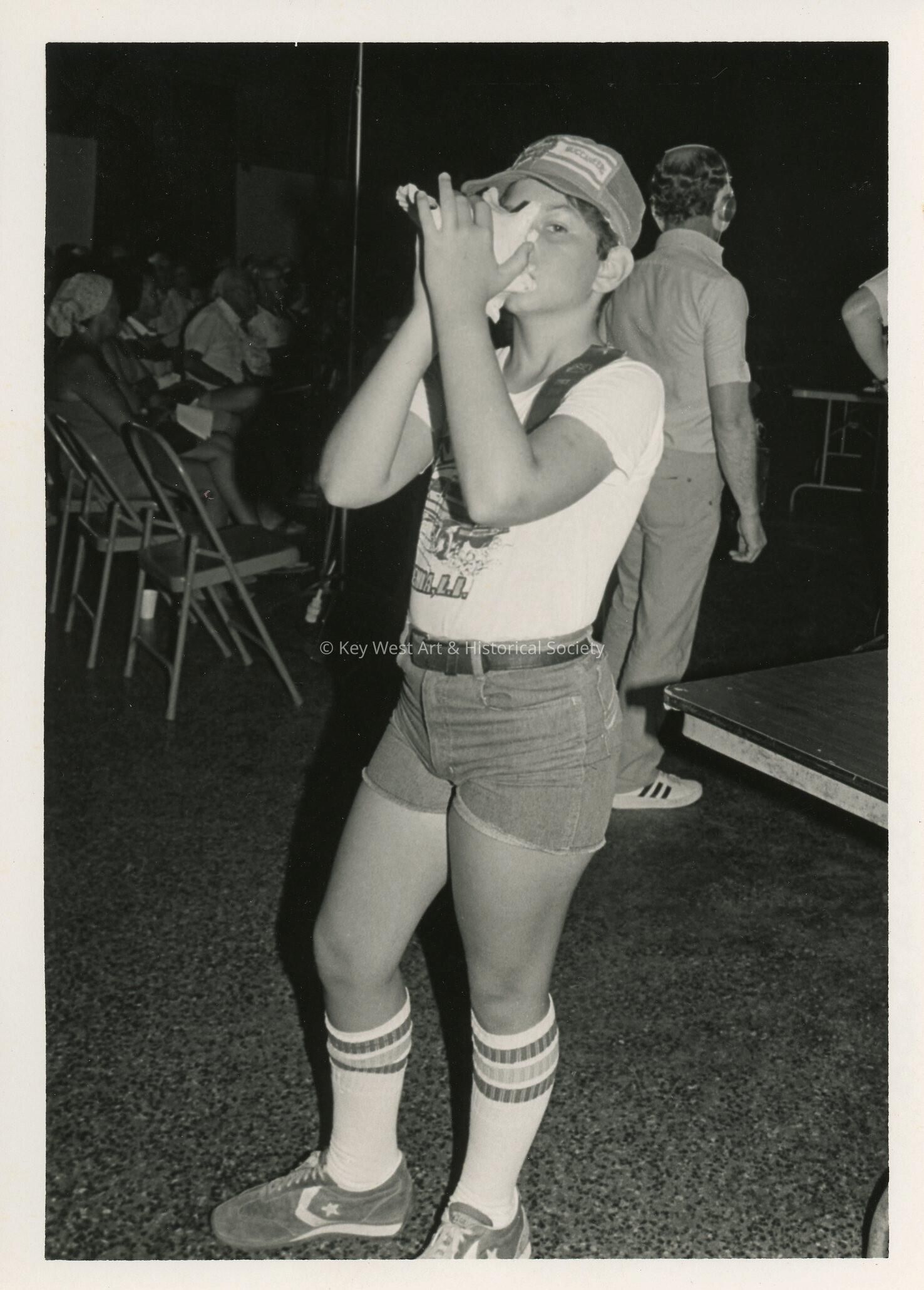 A child blowing a conch shell.