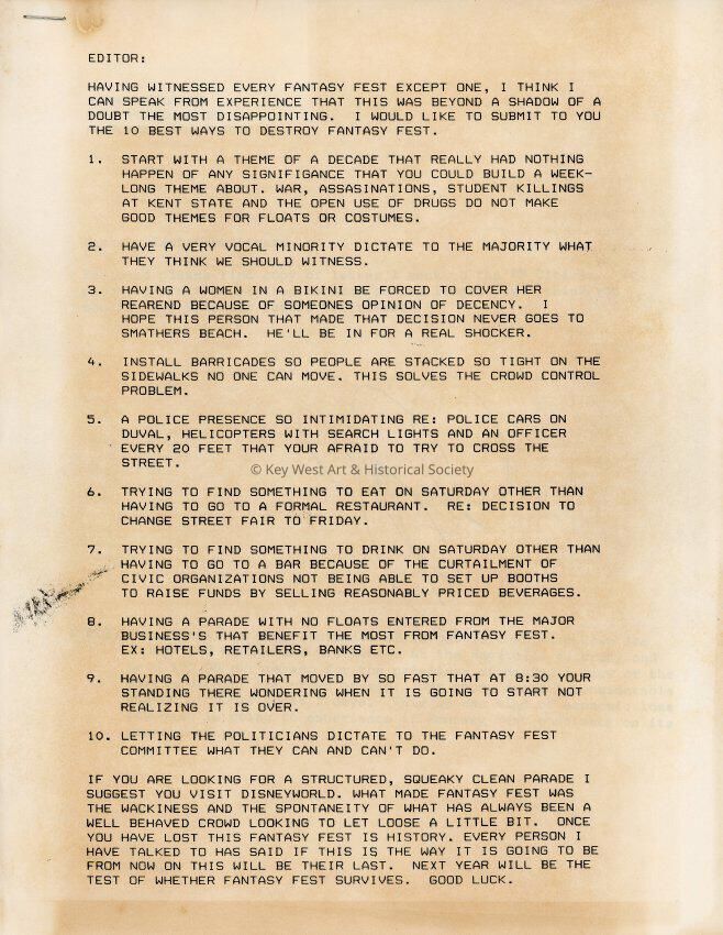 A copy of a letter to the Fantasy Fest committee that was sent to the Key West Citizen from Jerry Bessemer
