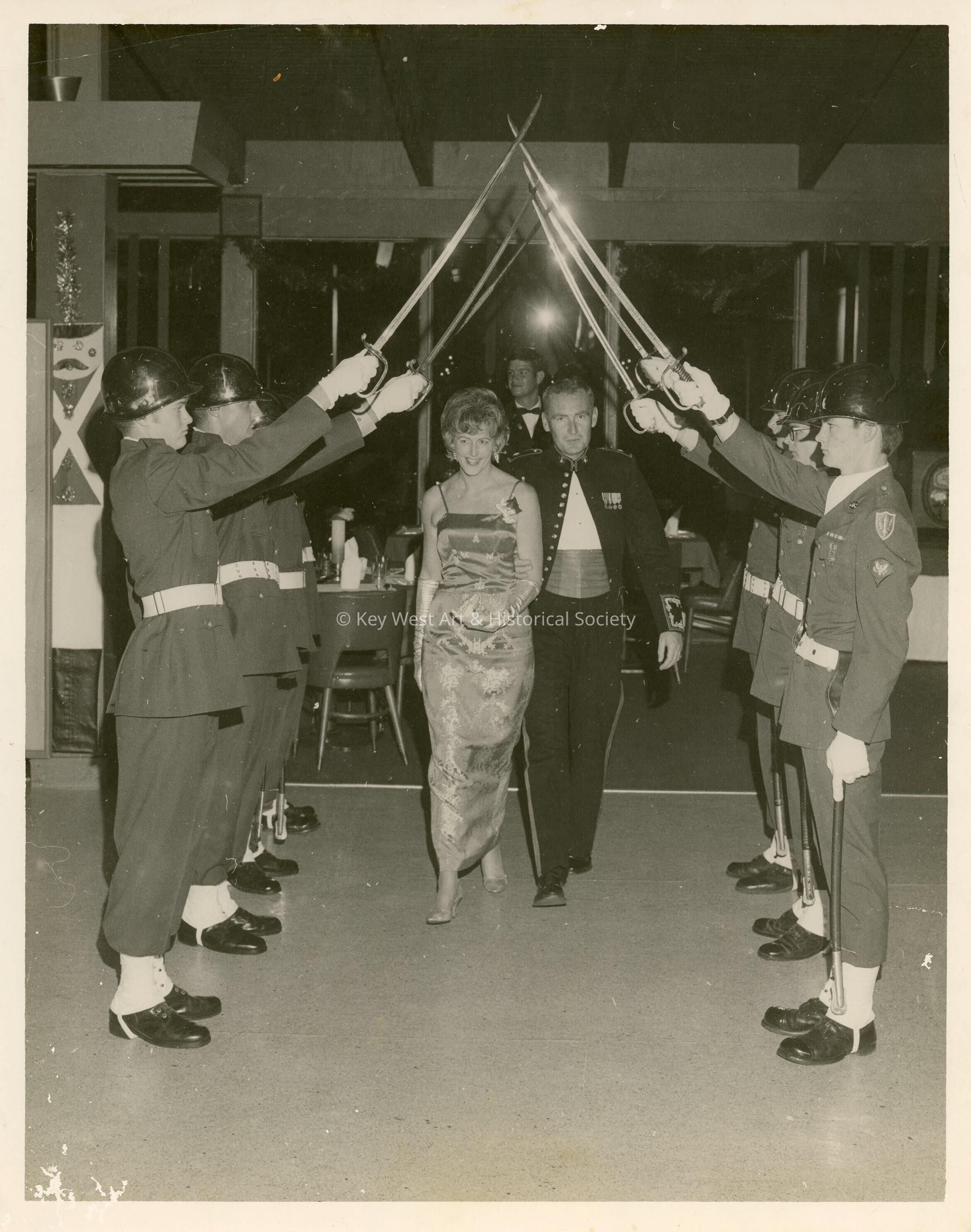 A Military man and woman walking under a sword archCollection