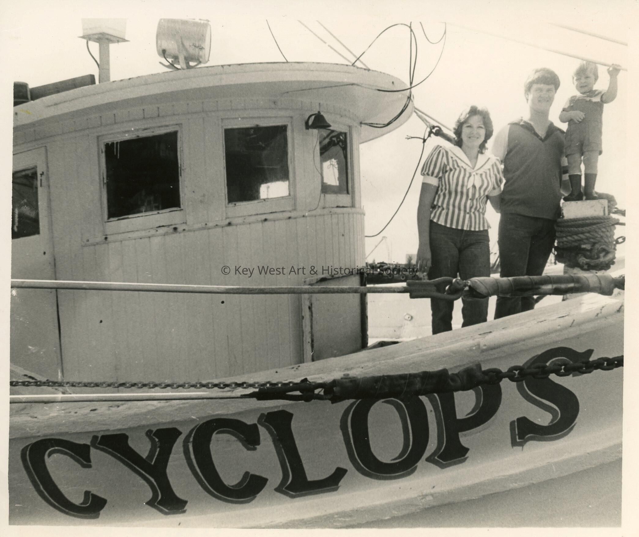 A family on a boat that reads Cyclops on the side.