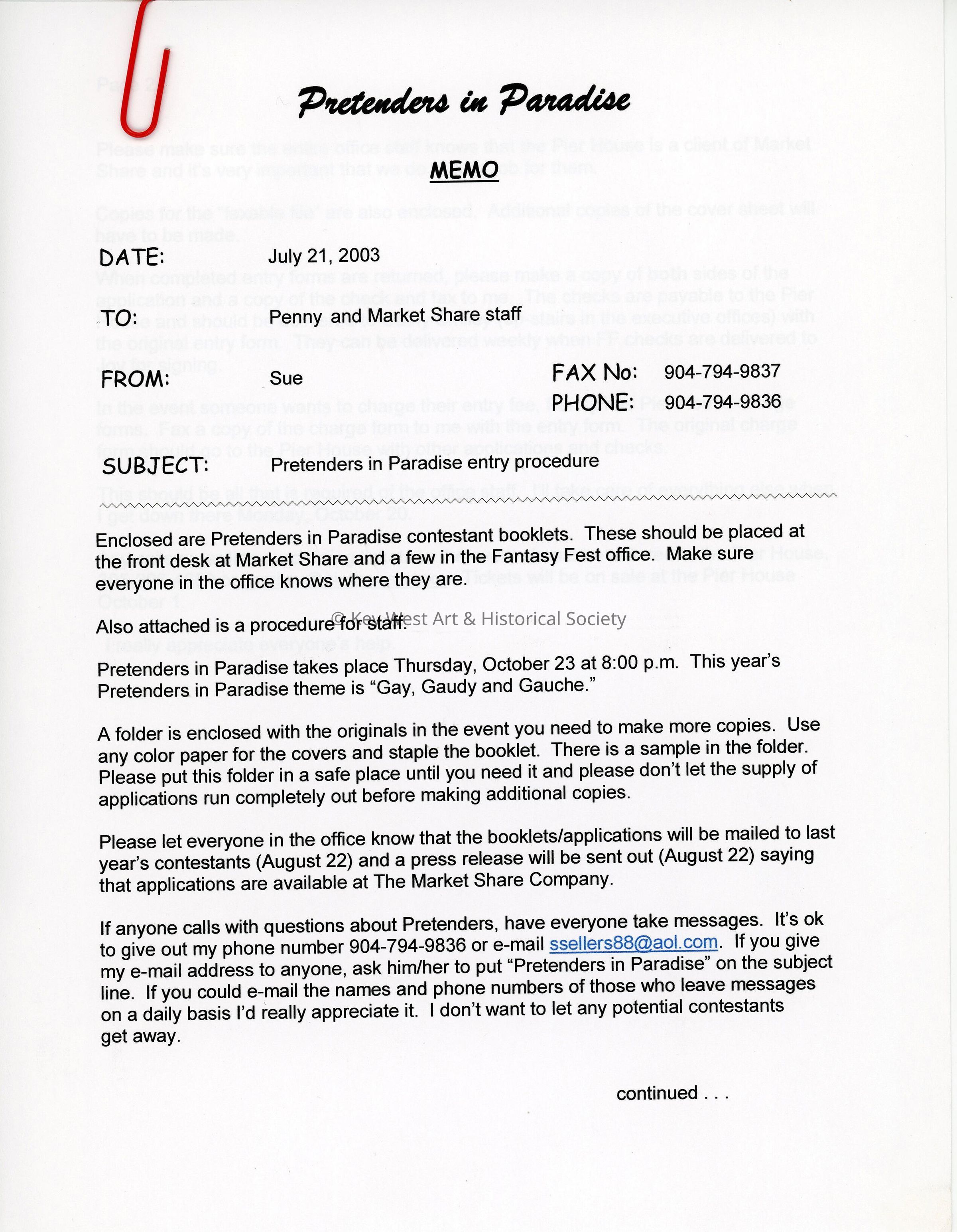 A fax to Penny and market share from Sue about the Pretenders in paradise entry procedure.