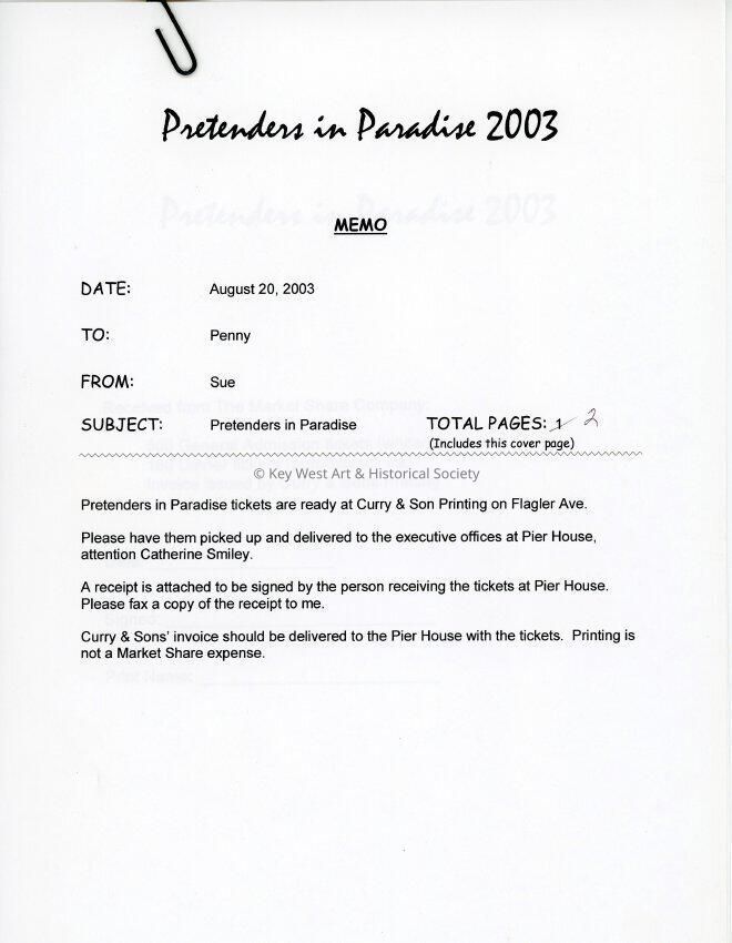 A fax to Penny from Sue regarding the pretenders in paradise tickets being ready at Curry and son printing.