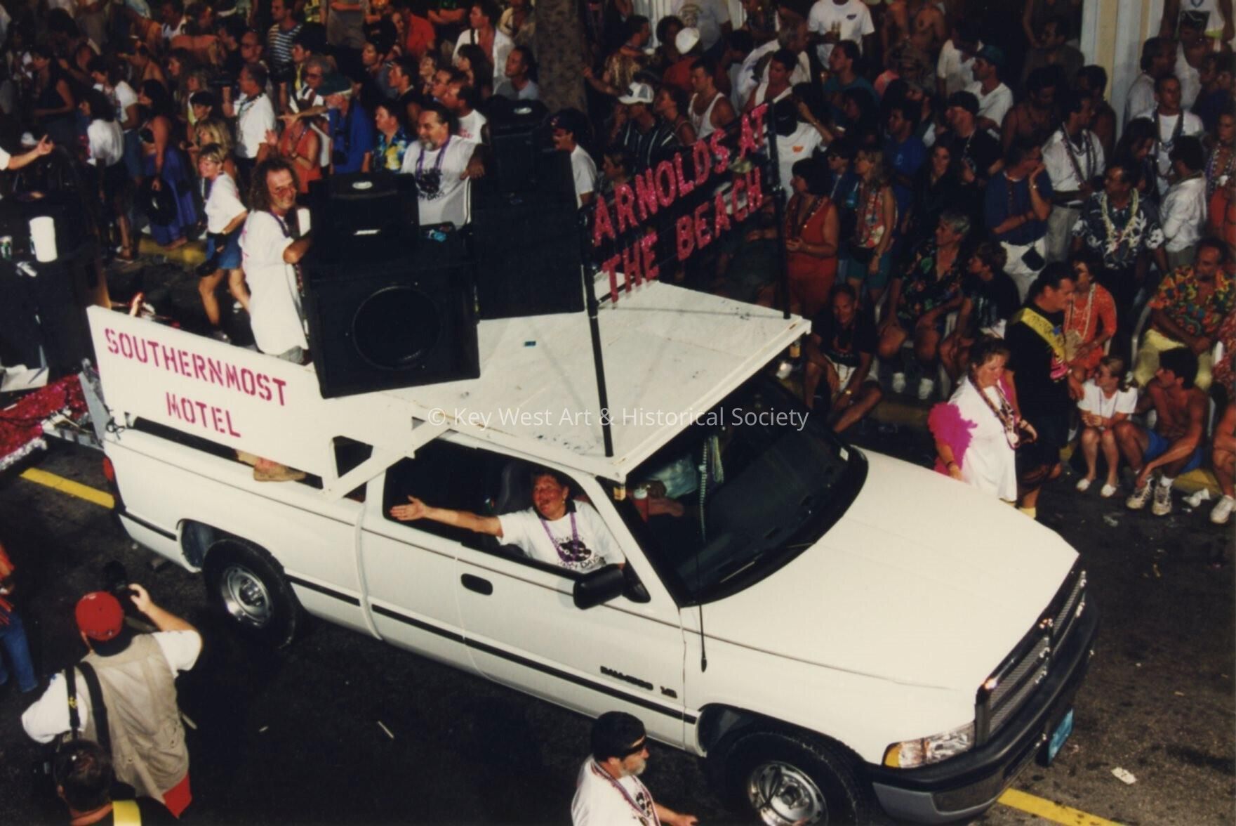 A float in the parade that reads Arnolds at the beach.Collection