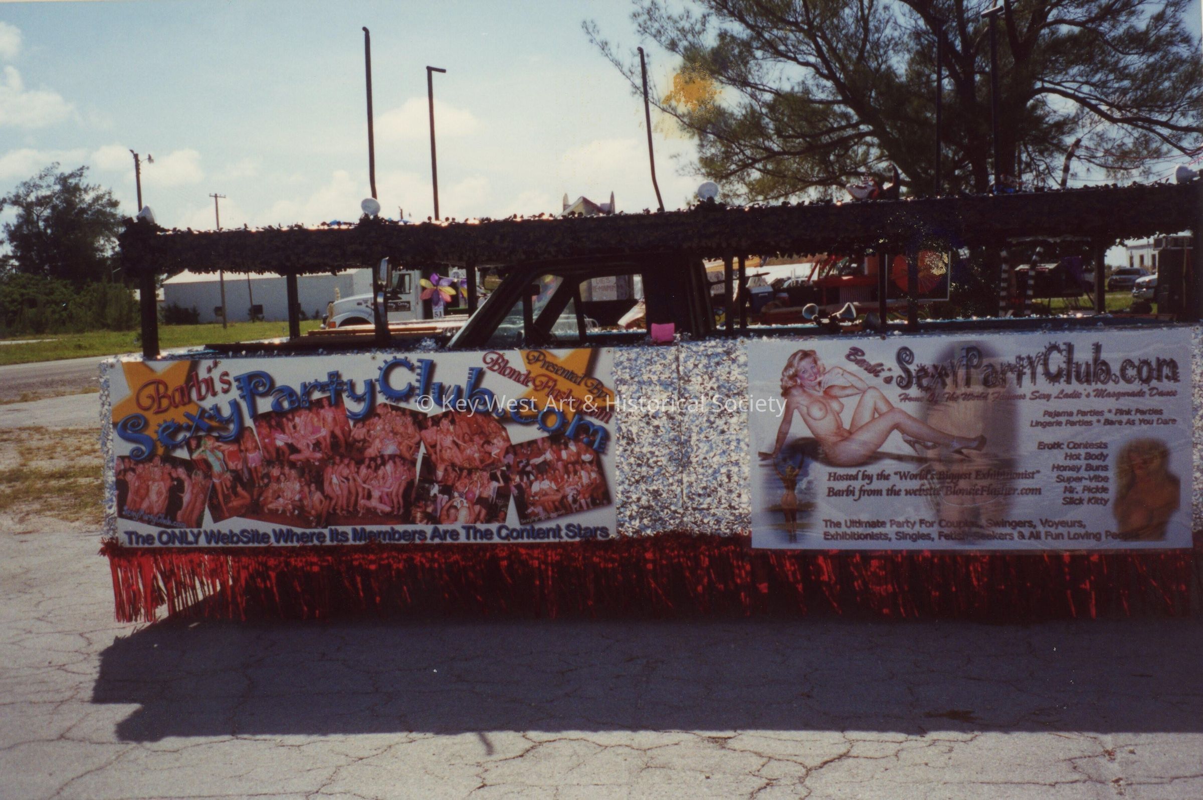 A float in the parade that reads Barbi's sexy party club.com.Collection
