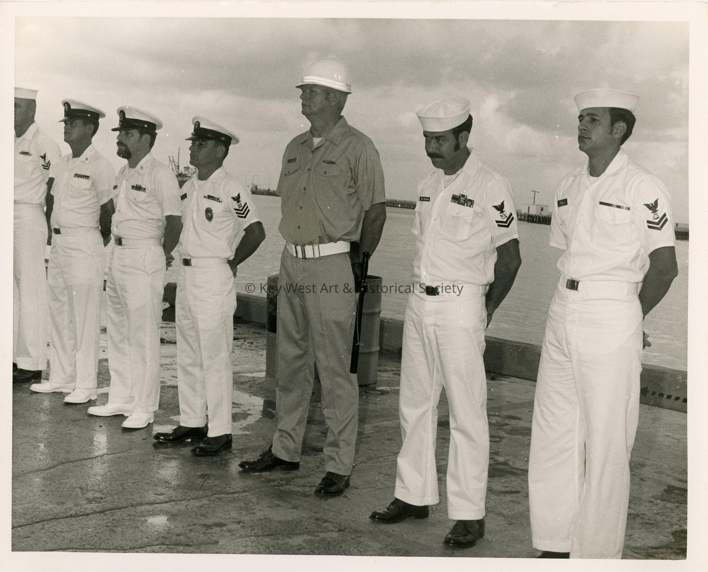A group of men in uniform standing by the pier