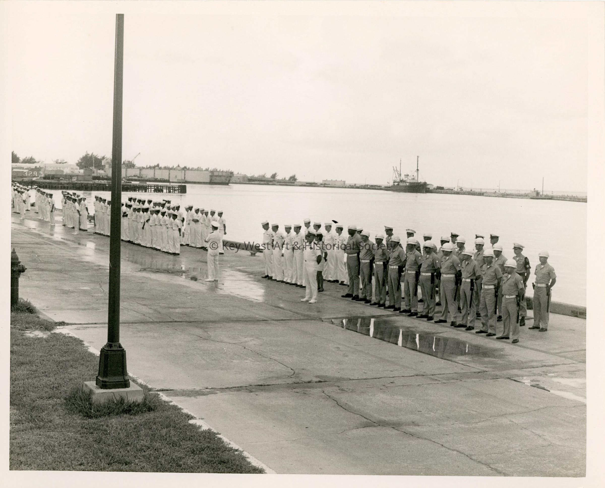 A group of men in uniform standing by the pier