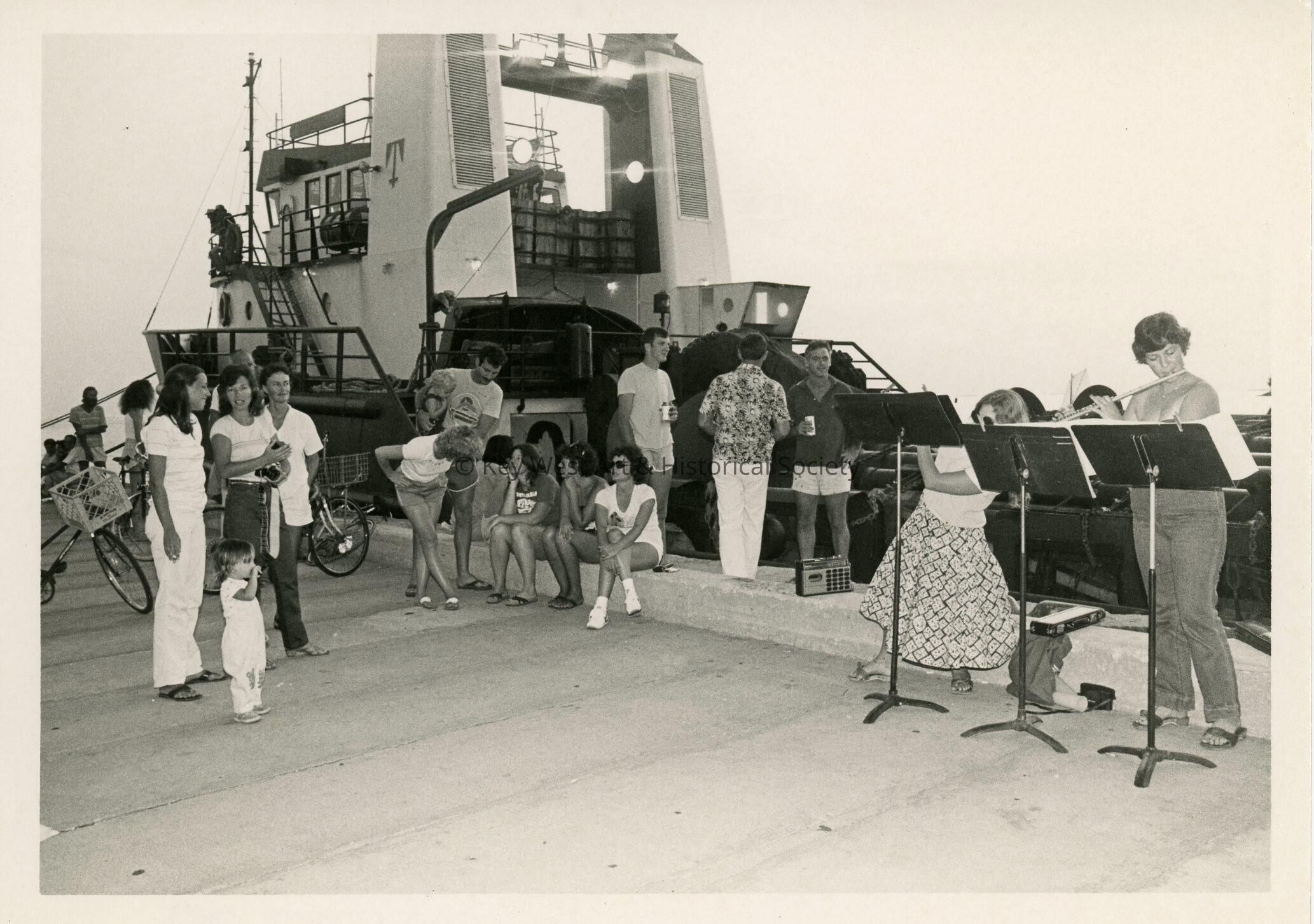 A group of people near a boat , a few playing instruments.Collection
