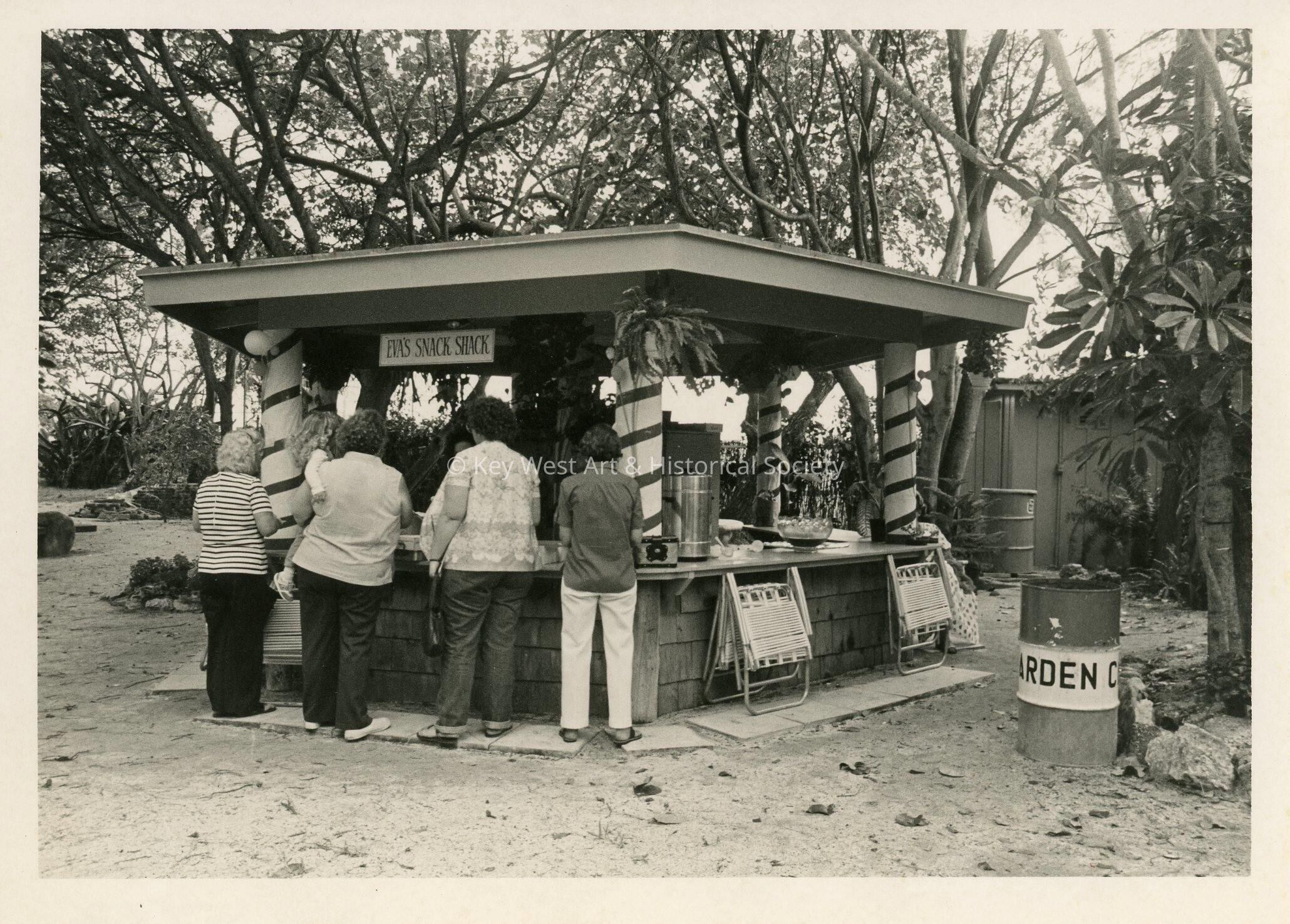 A group of people standing at a snack shack