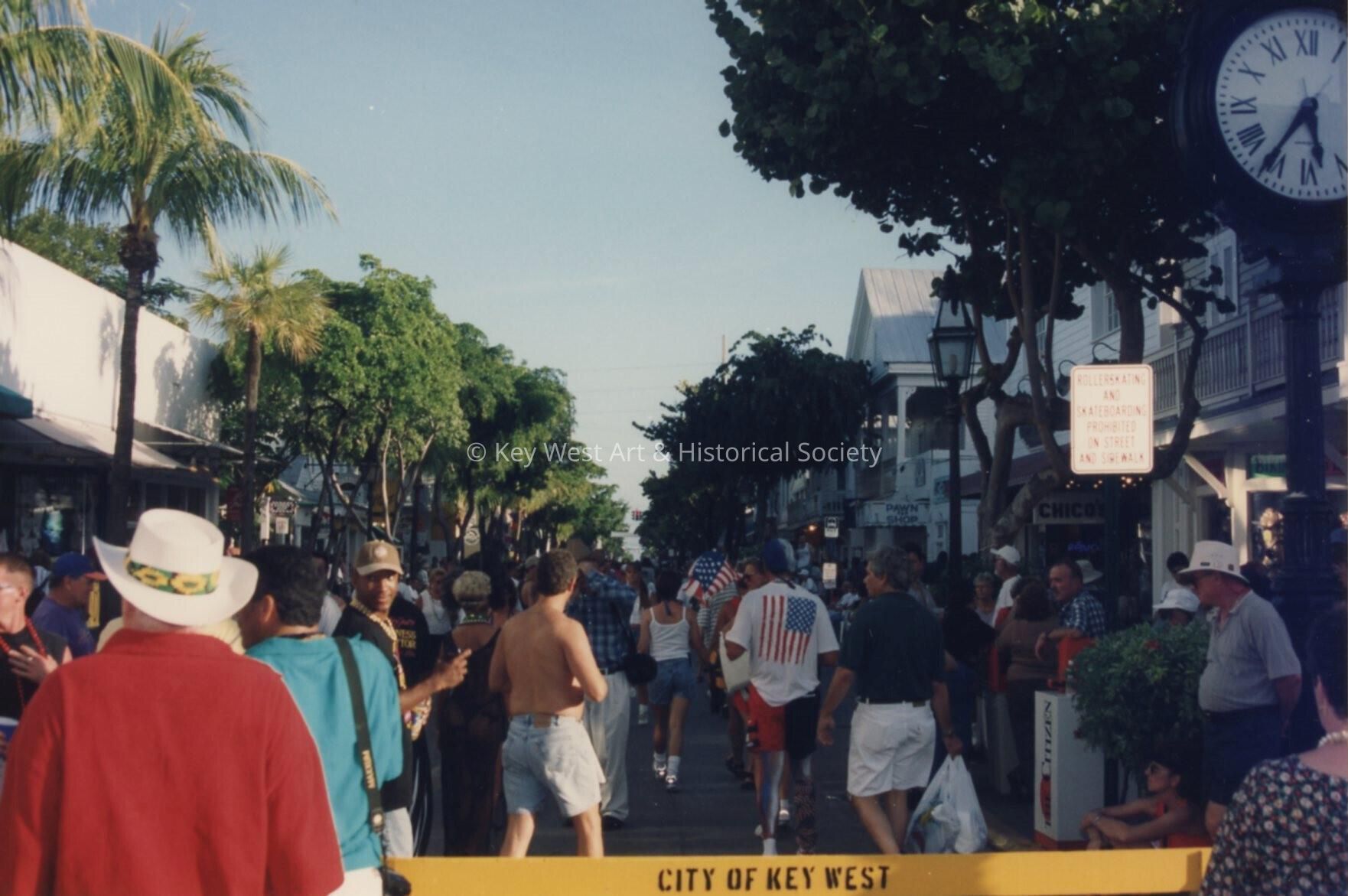 A group of people walking down Duval Street.