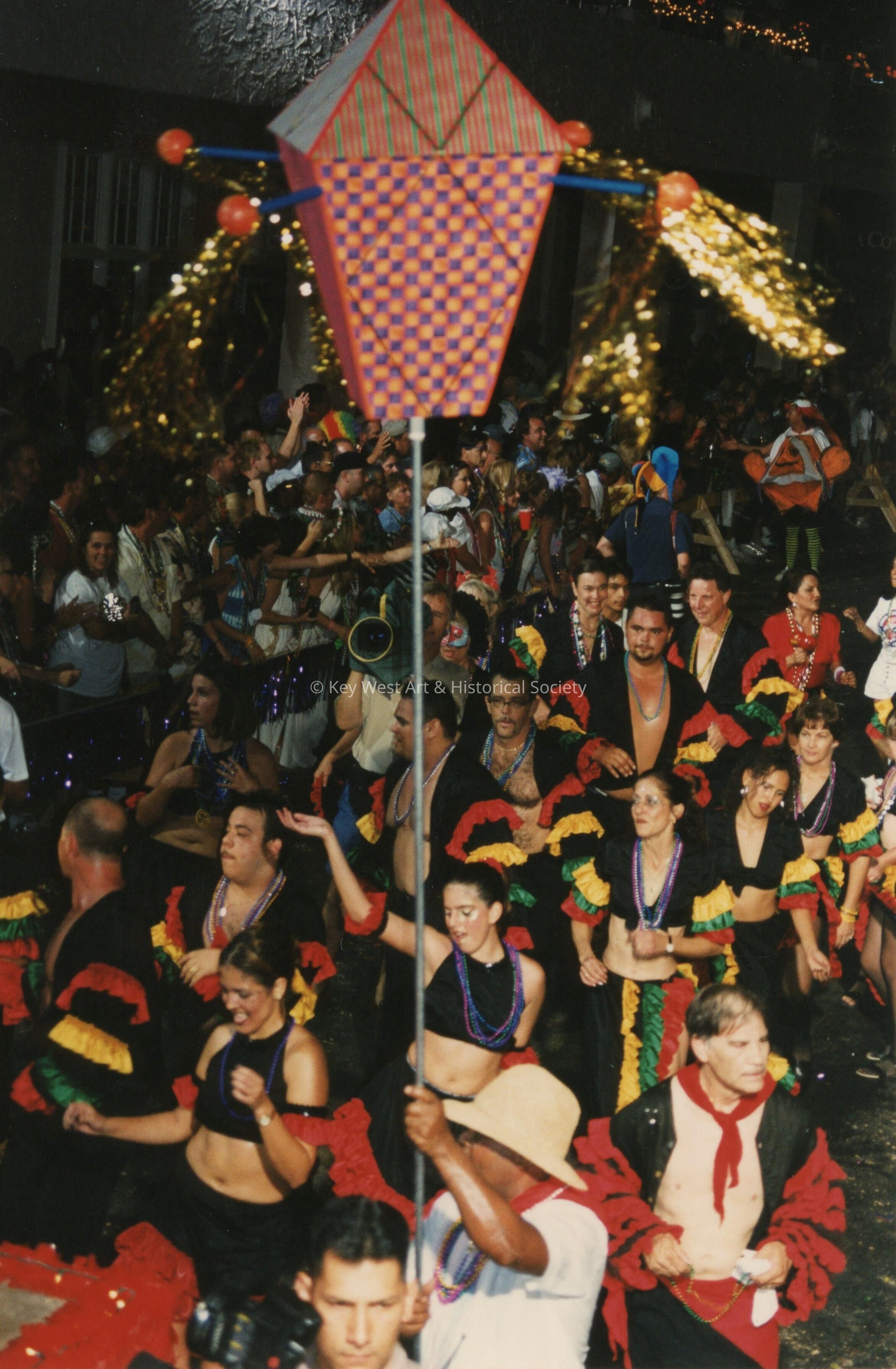 A group of unknown people dressed up dancing in the street for the parade.Collection