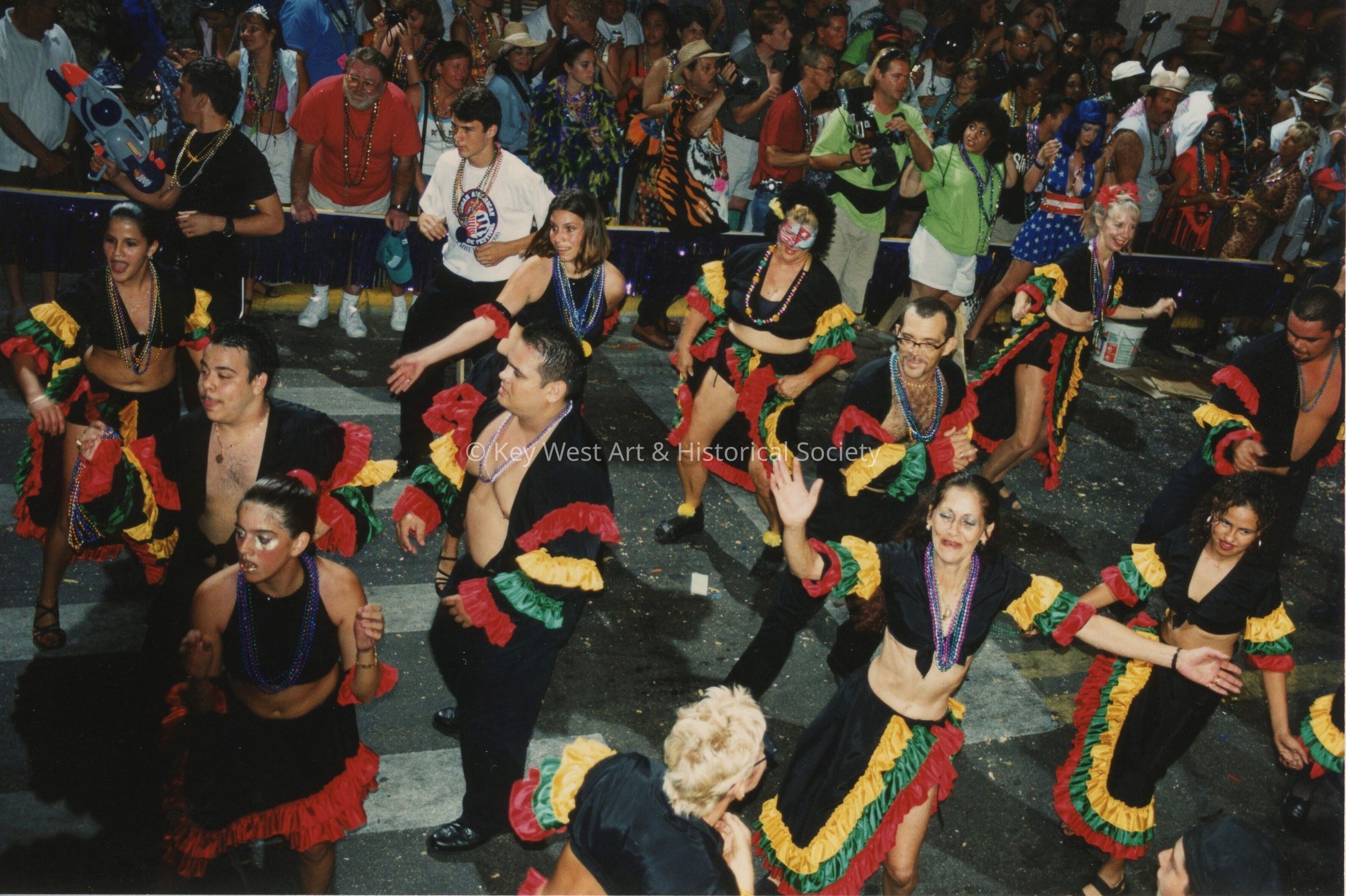A group of unknown people dressed up dancing in the street for the parade.Collection