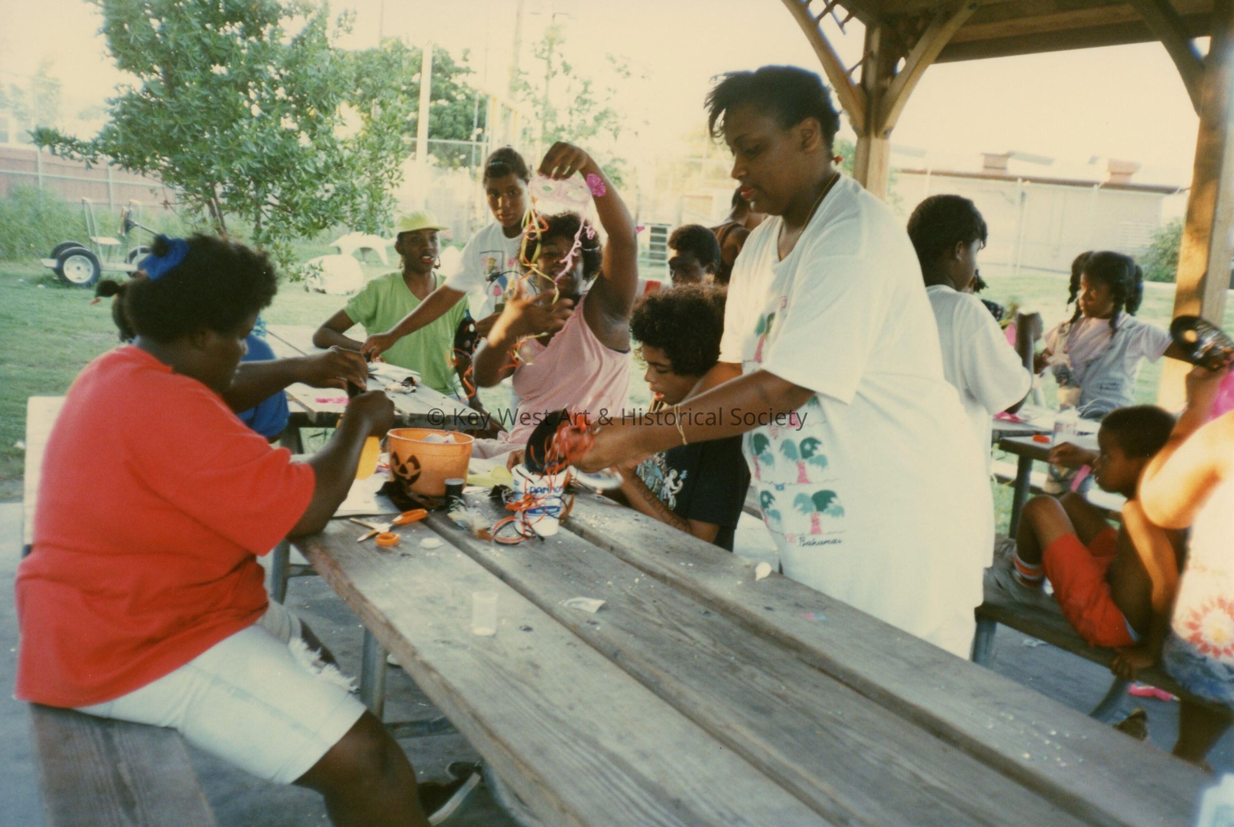 A group of unknown people working outside on a table on crafts.Entry/Object ID